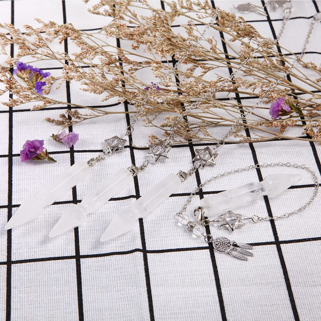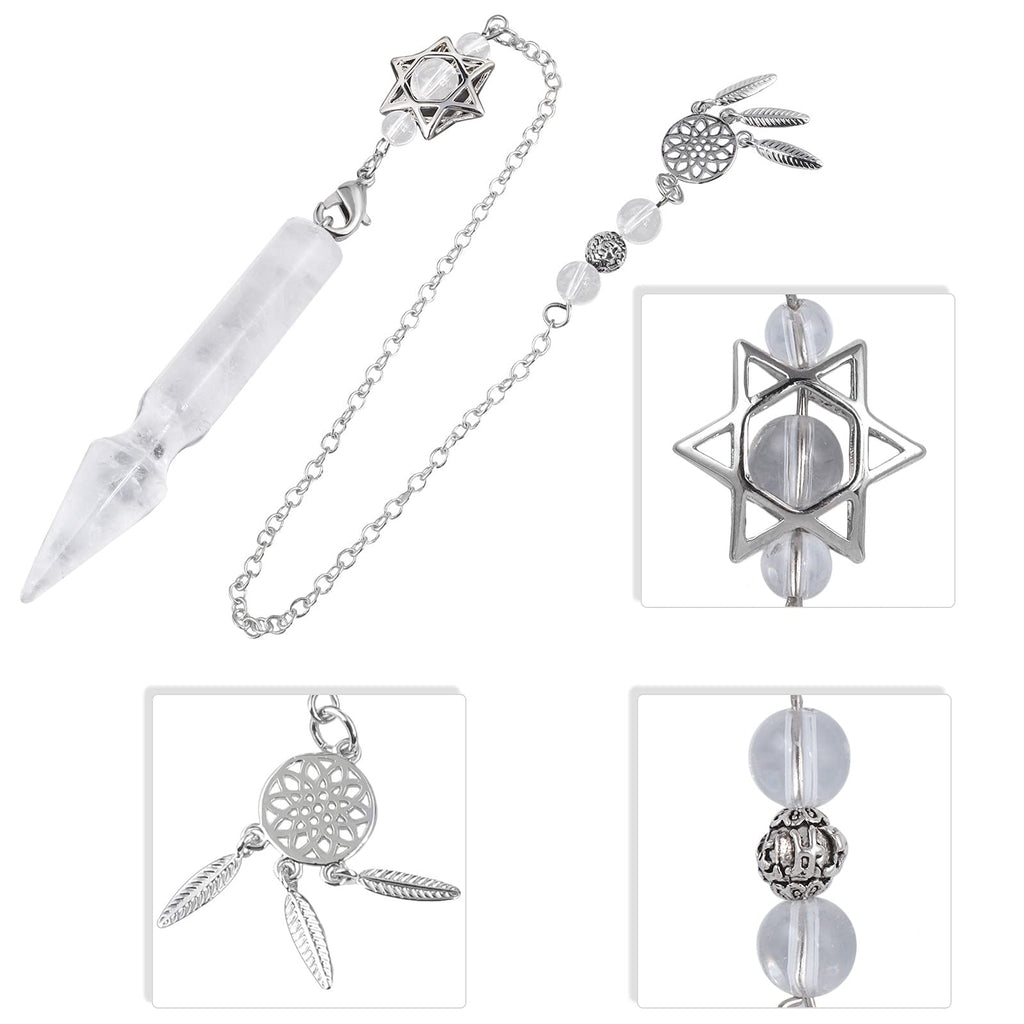 Reiki crystal point pendulum with elegant Merkaba dream catcher chain, is always used for wicca, dowsing divination and other chakra work. Crystal stone can help to filter negative energy and balance chakra, also ideal for meditation.Size: total length 11.81 (30cm), weight 16g and packed with a purple satin pouch.