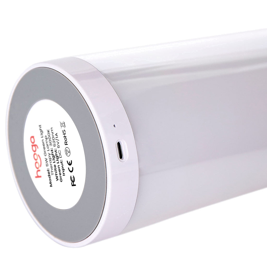 The Hooga Green Light Therapy lamp is a dual mode, touch controlled lamp that emits narrow band green light at 520 nanometers in order to soothe the brain and relieve migraines. The green light therapy lamp also has a soft, warm white light mode which is 3000K in temperature and makes for a fantastic all purpose light. The 5W light therapy lamp comes with a USB Type C power adapter and has a 10+ year LED life, so you won't need to worry about replacing this or changing the light bulbs on your bedside lamp any longer! Green light at specific wavelengths has been extensively studied at one of the world's leading universities. The studies show that regular light, made up of a full spectrum of colors such as red, yellow, green, blue, etc. actually generates large electrical signals in the eye and brain, which ends up causing pain and tension for people with light sensitivity. Conversely, the specific narrow band of green light emitted by the Hooga lamp (when on green mode) generates much smaller electrical signals in the eye and brain which does not cause pain for people with light sensitivity. When a migraine strikes, we recommend going into a dark room and turning on the Hooga lamp with the green mode on. Then, eliminate all other sources of light in the room, including light from outside, computer screens, cell phone screens, television screens, overhead lights, etc. Position the Hooga lamp in such a way that it is illuminating the room but you aren't looking directly at it. Spend at least 30 minutes in the soothing, green light to allow for enough time for your eyes and brain to adjust to the different wavelengths of light.
