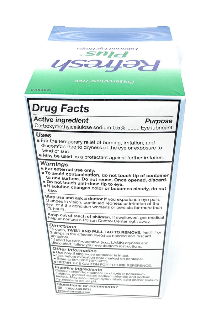 Refresh Plus Eye Drops does more than just soothe and relieve dry and irritated eyes. It also provides long-lasting moisturizing protection in a formula that contains many of the same healthy qualities as natural tears. Refresh Plus is preservative-free for sensitive eyes, and can be used as often as needed to provide 24-hour comfort.