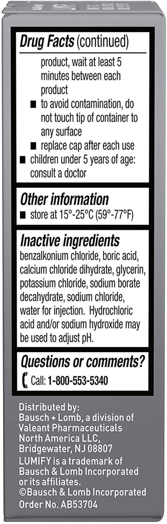 LUMIFY eye drops significantly reduce redness to help eyes look whiter and brighter, revealing your eyes natural beauty. What makes LUMIFY so unique? Well, weve got an ingredient no other over-the-counter eye drop has: low-dose brimonidine. It selectively targets redness in your eyes, which leads to a lower risk of the side effects associated with other redness relievers when used as directed. That way, you can significantly reduce redness to help eyes look whiter, brighter, and amazing for up to 8 hours. Relieves redness of the eye due to minor eye irritations