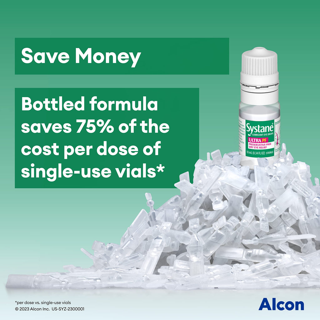 Systane Ultra lubricant eye drops are clinically proven to deliver extended protection and high-performance dry eye symptom relief that lasts. Systane lubricating eye drops for dry eyes provide soothing comfort, add moisture, and leave eyes feeling refreshed. This unique formula helps provide temporary relief of burning and irritation due to dryness of the eye or minor irritations due to explosure to wind or sun. Shop the entire Systane assortment of eye care products. Choose Systane, the #1 Doctor Recommended Brand for dry eye symptom relief. #1 Dr Recommended Brand Can be used by contact lens wearers *1 Fast-acting hydration for sensitive eyes Unique bottle saves nearly two pounds of plastic per year *2 Extended protection for dry eye symptom relief that lasts Multi-dose preservative-free bottle saves 75% of the cost *3 1 bottle = 120 single use vials2*1 Not a rewetting drop2 Assessment based on assumption of 1 bottle of SYSTANE HYDRATION MDPF for 60 days of use, and two unit dose vials used per day.3 vs. SYSTANE HYDRATION UD*Alcon data on file, 2021.