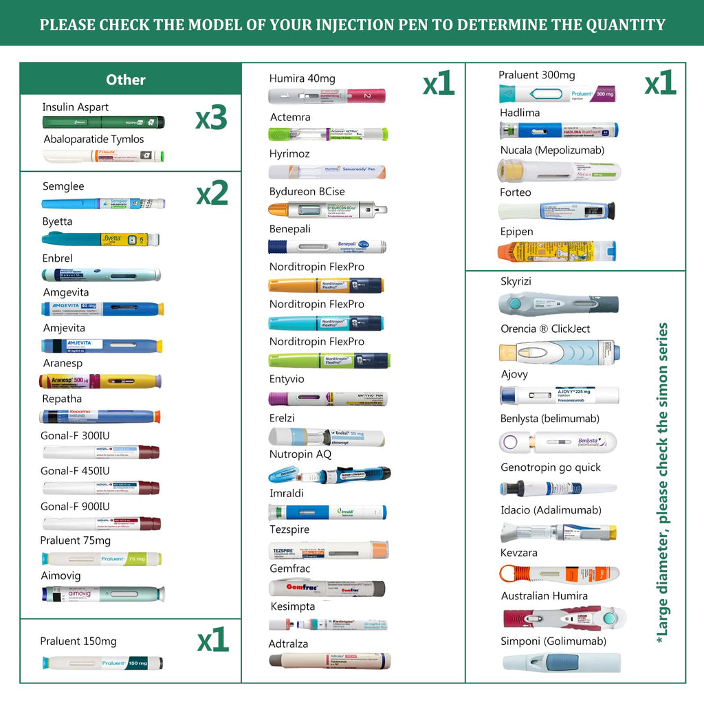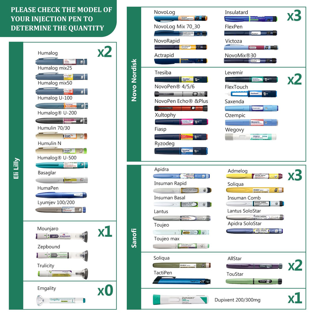 • Q: Is this insulin cooler compatible with all types of insulin pens? A: Yes, the cooler is designed to fit up to 95% of popular brands and sizes of injection pens. For detailed compatibility, please refer to the compatibility table in the product images.