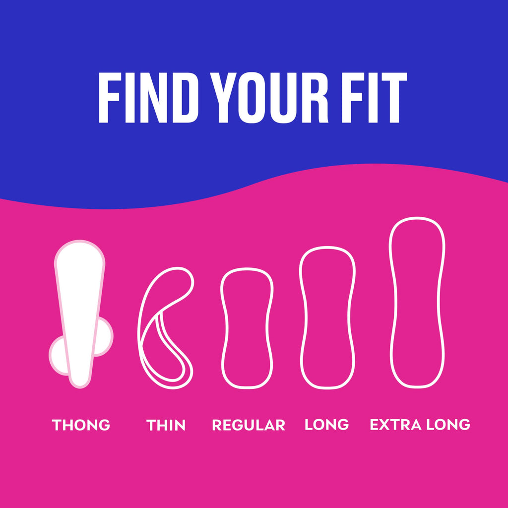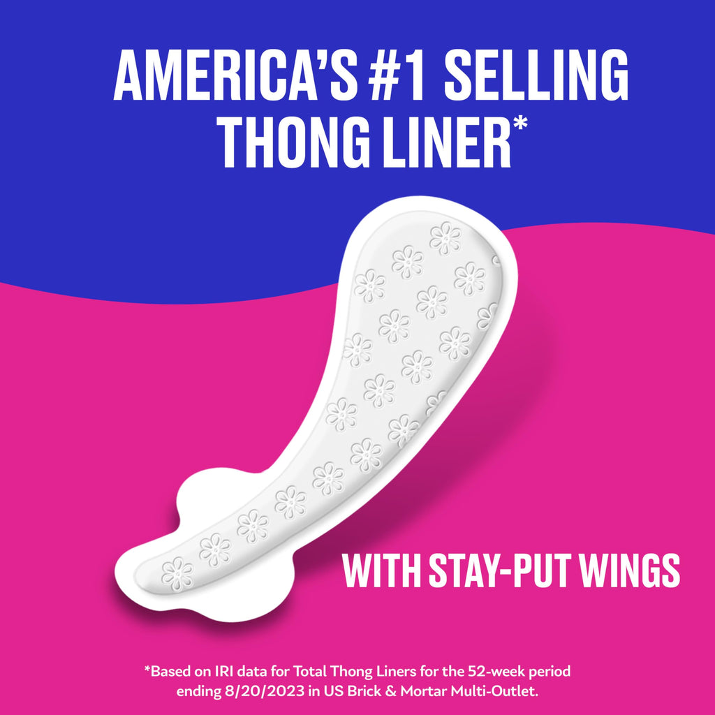 Introducing a whole new look for the Carefree brand you know and love. Carefree panty liners are designed to deliver comfort and multi-fluid protection against leaks, periods, odors, and everything in between. Carefree thong liners are discreet and made to fit thong underwear, to provide you confidence no matter what you wear. Stay-put wings keep your liner in place for a secure, no-shift fit, and end-to-end adhesive eliminates bunching. These liners for women can be used for every day freshness, odor control, sweat, unexpected periods, light days, tampon backup, leaks, and discharge.