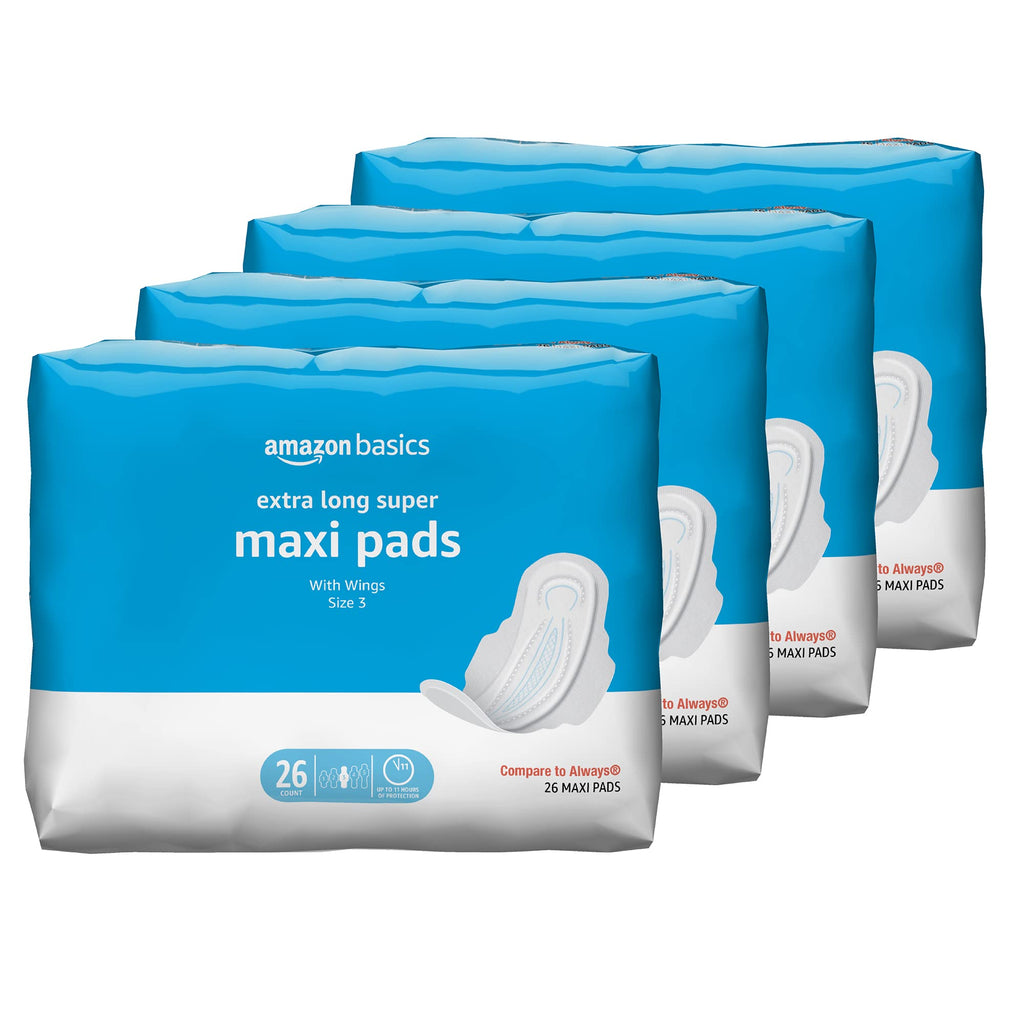 Amazon Basics Maxi Pads with Flexi-Wings, Extra Long Super Absorbency, Size 3, are designed to provide a new level of skin health and protection through their Dri-Fit technology. The cotton enhanced and breathable outer layers wick away moisture 2x faster to help your skin stay dry and comfortable. The super absorbent core provides up to 10 hours of leakage protection. You can identify your best fit through the sizing chart to help prevent leaks and get the ultimate coverage.
