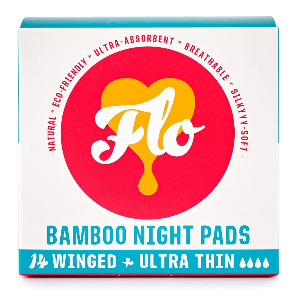 Ultra-absorbent + silky-soft: our Night Pads are made with sustainably-sourced organic bamboo which feels silky soft and is ultra-absorbent. FLO pads always keep you dry and comfortable all night long, sleep with leak-free peace of mind. No bunching or scrunching, these ultra-thin overnight pads with wings stick to your underwear. | Plant-Powered Period: 100% organic bamboo sustainable pads always made with silky-soft, sustainably-sourced Oeko Tex certified organic bamboo | Organic + natural ingredients: no harsh chemicals, bleach, chlorine or dyes so you can purchase with absolute confidence and no irritation. Sensitive skin friendly. | Sustainable packaging: our eco-friendly overnight pads are biodegradable and individually wrapped in 80 compostable, plant-based, plastic-free wrappers for on the go, packed in a 100% recyclable box | Every pack gives back: 5% of profits go to people + planet, FLO is founded by women for people who menstruate. Plus, we're PETA-certified Vegan and Cruelty-Free & BCorp Certified!