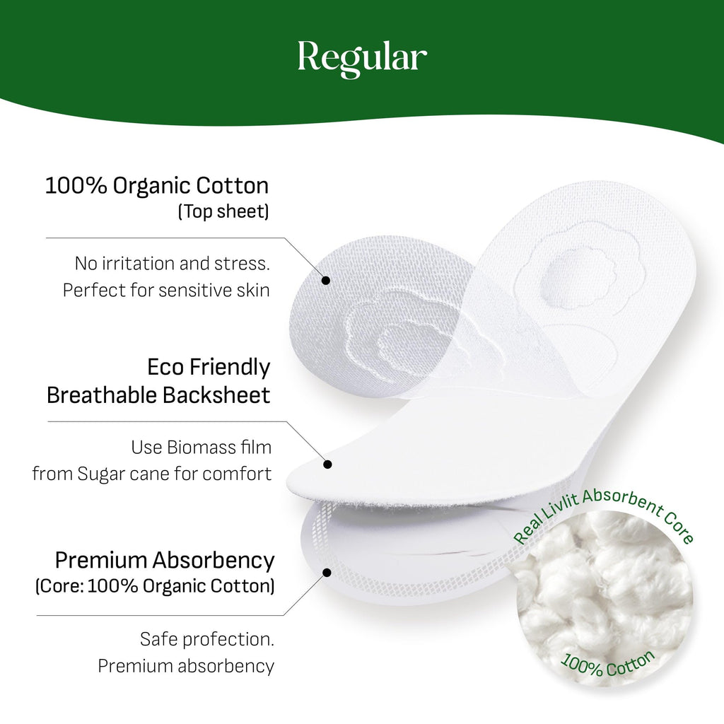• Q: What materials are Livlit Regular Size Ultra Thin Sanitary Pads made from? A: Livlit Regular Size Ultra Thin Sanitary Pads are made from 100% certified organic cotton, ensuring a hypoallergenic and soft experience.