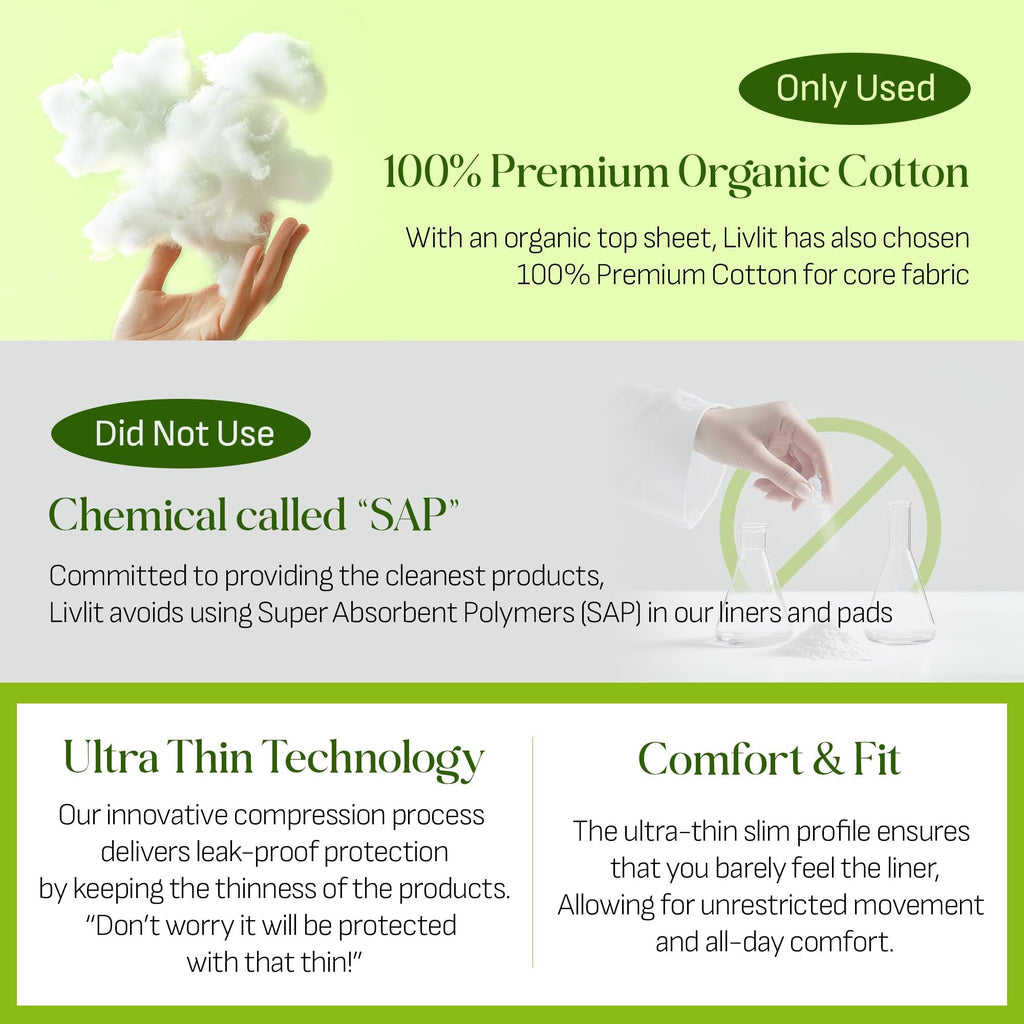 100% CERTIFIED ORGANIC COTTON TOP SHEET: Indulge in the luxurious comfort of Livlit's certified organic cotton, designed to be hypoallergenic and irresistibly soft as cashmere. Laboratory-tested and OCS-certified, our pads are free from chlorine, dyes, and fragrance. | SAP-FREE CONFIDENCE: Unlike traditional options, Livlit products offer SAP-free protection. Our advanced technology ensures you stay dry without superabsorbent polymers (chemical), delivering worry-free comfort and care. | PREMIUM ABSORBENCY: Elevate your period experience with Livlit organic pads and liners. Discover reliable, organic protection without compromising on performance. Exceptional absorbency for peace of mind. | GENTLE CARE FOR SENSITIVE SKIN: Experience a soothing embrace with Livlit pads. Even the most delicate skin finds ease as you bid farewell to irritation and discomfort, welcoming a newfound level of confidence. | UNPARALLELED COMFORT IN ULTRA-THIN DESIGN: Redefine your period experience with Livlit's ultra-thin innovation. From bustling days to serene evenings, our discreet protection and comfort ensure you stay at ease, always.