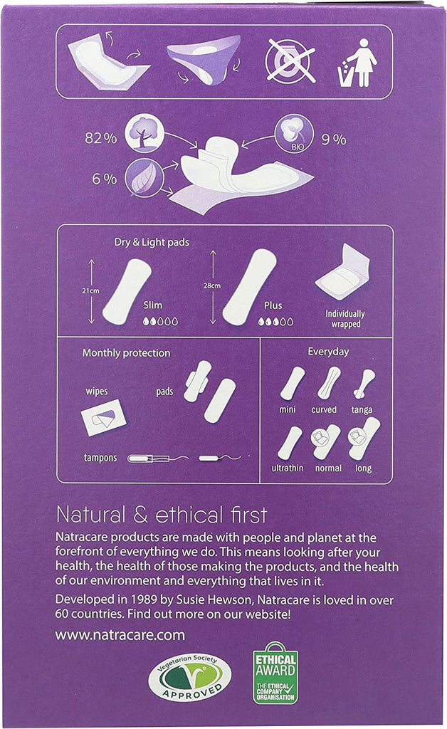 Natracare Dry and Light Incontinence Pads 6 Packs of 20 (120 Pads Total) - Natural and absorbent pads for light urinary incontinence. Natracare Dry & Light pads are the first of their kind. They are absorbent and comfortable, without the usual plastics and perfumes that you find in most incontinence products. Ingredients: Certified organic cotton, ecologically certified cellulose pulp, and plant starch. Glue: BPA-free, medical-grade polymer. Wrapper: Silicone-coated paper peel strip, paper pocket. Incontinence and other absorbent hygiene products are some of the worst offenders for causing intimate irritation and soreness. Research shows that up to a 1/3 of women and people with vulvas suffer from itching and irritation because of contact with synthetic materials, including those used to make incontinence pads. The Dry & Light Slim pad has a compressed pulp core to effectively absorb without harsh chemicals. The pads come without wings and stay firmly in place with a non-toxic glue strip. The pads are individually wrapped making them easy to carry around. Barcode: 0782126003508.