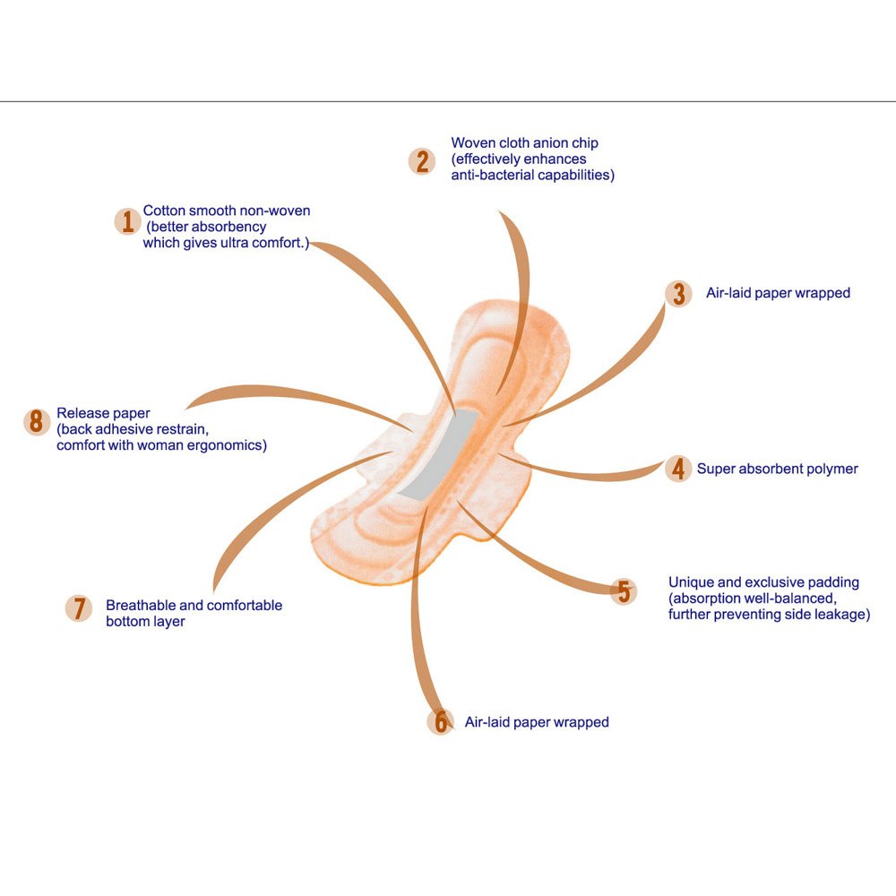 Shuya active oxygen & far-IR & anion cotton sanitary Pads for women is made of eight-layers with food-grade materials;1st layer: Thin silk and soft cotton fast absorption surface allows the liquid to absorb three times faster.2ndlayer: International advanced active oxygen & anion chip3rd layer: Air-laid paper wrapped4th layer: Super absorbent polymer(SAP imported from Japan)5th layer: Professional diversion layer(can accelerate the liquid to proliferate rapidly, is helpful to flicker attracts, prevents the side to leak)6th layer: air-laid paper wrapped7th layer: PE breathable leak-proof bottom layer8th layer: Adhesive glue release paper (Regular Pad) Size : 245mmPackage : 10pieces/packUsage: in the day time of the menstrual period. (Overnight Pad) Size: 285mmPackage: 8pieces/packUsage: in night time of the menstrual period; or in day time if suffer from heavy periods ( Ultral long Overnight Pad) Size: 330mmPackage: 8pieces/packUsage: for big and heavy bleeding in women menstrul periods (Panty liners) Size: 155mmPackage: 30pieces/packUsage: before and after 2 day of menstrual period, or any daily time if you like it