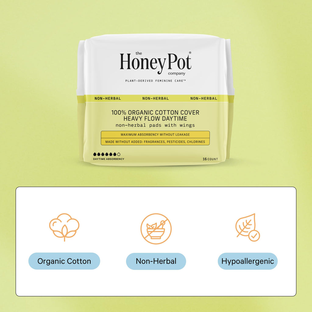 We see you. Weve listened. And we understand. Heavy flows are no fun. In fact, they can cause you to dread your period and can be the byproduct of larger medical challenges. Thats why we created honeypot approved non-herbal pads with supreme absorbency to ensure you are secure and protected throughout your cycle. With incredible absorbency and total freedom, our Non-Herbal Heavy Flow Daytime pads are for use throughout the day without the dreaded fear of having to change your pad every 1-3 hours. These non-herbal, hypoallergenic daytime menstrual pads have a super soft OCS certified organic cotton cover and ultra-absorbent pulp core which ensures maximum comfort and minimal leakage. Heres to a new relationship with your pads.
