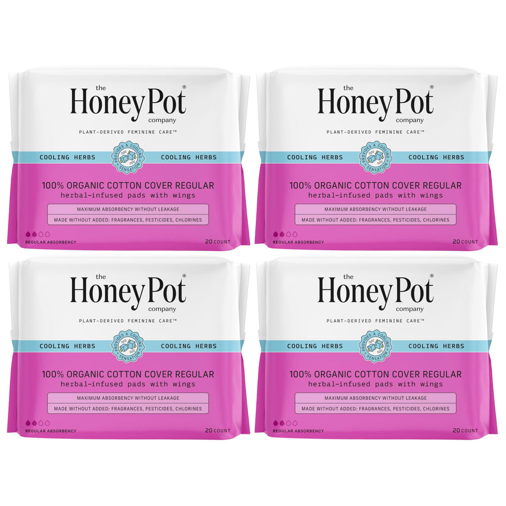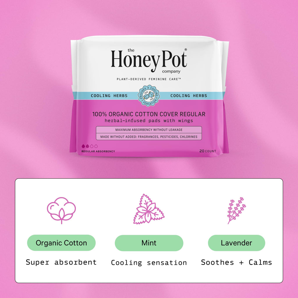 The notorious Honey Pot cooling sensation that makes peace with your period is now paired with an OCS certified organic cotton cover for worry-free moments when needed most. The Honey Pot Herbal-Infused Regular Pads combine the power of herbs with our absorbent technology to create a pad that is breathable and keeps you fresh all day and all night. The Honey Pot's clinically tested pads are made with OCS certified organic cotton cover and are gynecologist-approved. Our regular pads are to be used on normal days for effective protection, providing a cool and comfortable experience. Our herbal sanitary pads are crafted with an OCS certified organic cotton cover and infused with essential oils, creating a ''cooling'' effect that helps soothe when you need it most. With lavender, rose, aloe vera and mint, our organic cotton cover menstrual pads are designed to soothe, refresh and protect. When using the herbal regular pads, you will feel a refreshing, cooling sensation that is unlike any other pad you have ever used. Heres to a new relationship with your menstrual care products! A message from Bea Dixon, Founder of The Honey Pot Company Plant-derived feminine care from my kitchen to your hands - I was suffering with BV for 8 months when an ancestor came to me in a dream and gifted me with a vision to heal myself. With her help I created The Honey Pot to solve for what other brands wouldn't - feminine care powered by herbs that is backed by science, clinically tested and gynecologist-tested. The Honey Pot Company provides humans with the tools and resources that promote health and wellness. Made by humans with vaginas, for humans with vaginas. Because it takes one to know one.