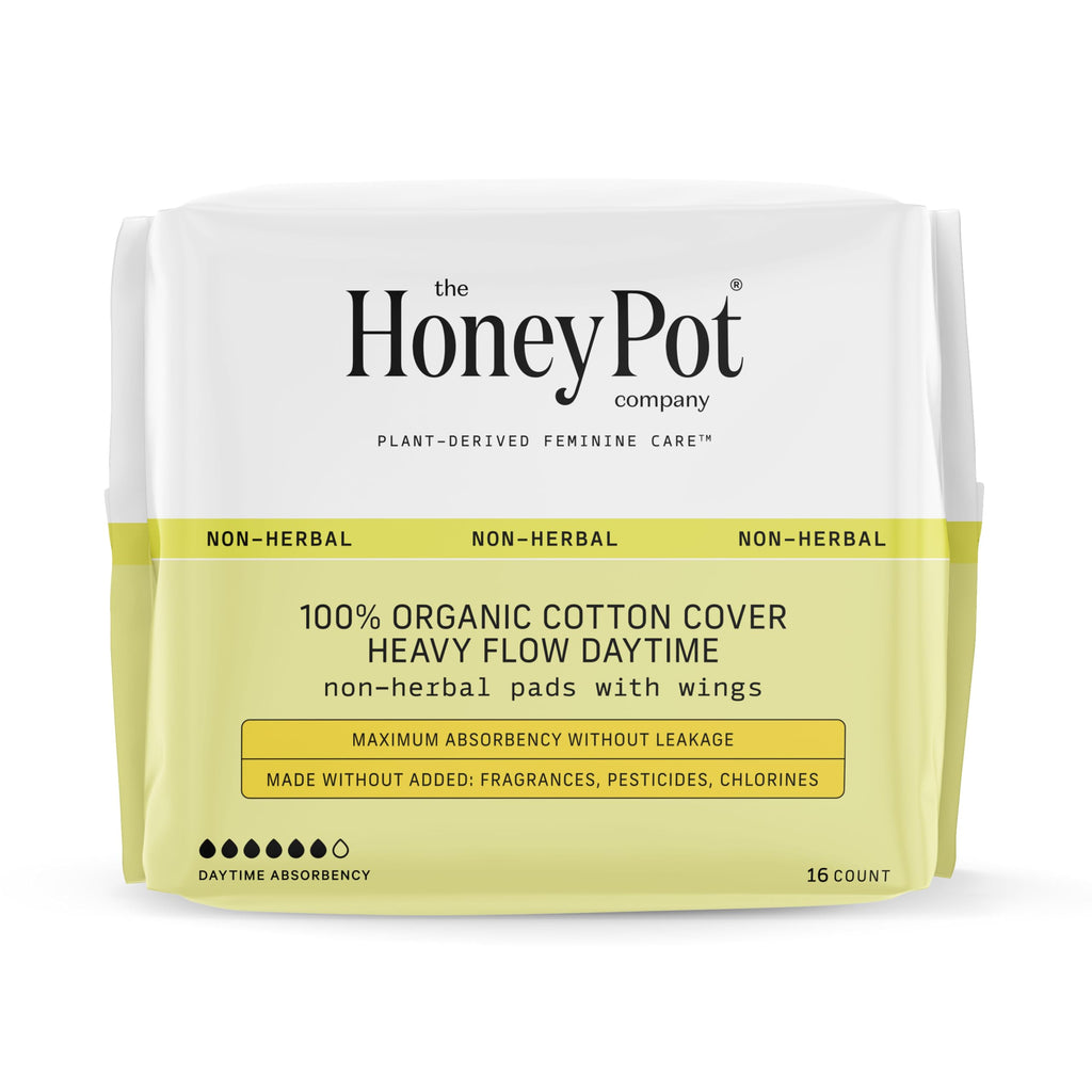 We see you. Weve listened. And we understand. Heavy flows are no fun. In fact, they can cause you to dread your period and can be the byproduct of larger medical challenges. Thats why we created honeypot approved non-herbal pads with supreme absorbency to ensure you are secure and protected throughout your cycle. With incredible absorbency and total freedom, our Non-Herbal Heavy Flow Daytime pads are for use throughout the day without the dreaded fear of having to change your pad every 1-3 hours. These non-herbal, hypoallergenic daytime menstrual pads have a super soft OCS certified organic cotton cover and ultra-absorbent pulp core which ensures maximum comfort and minimal leakage. Heres to a new relationship with your pads.
