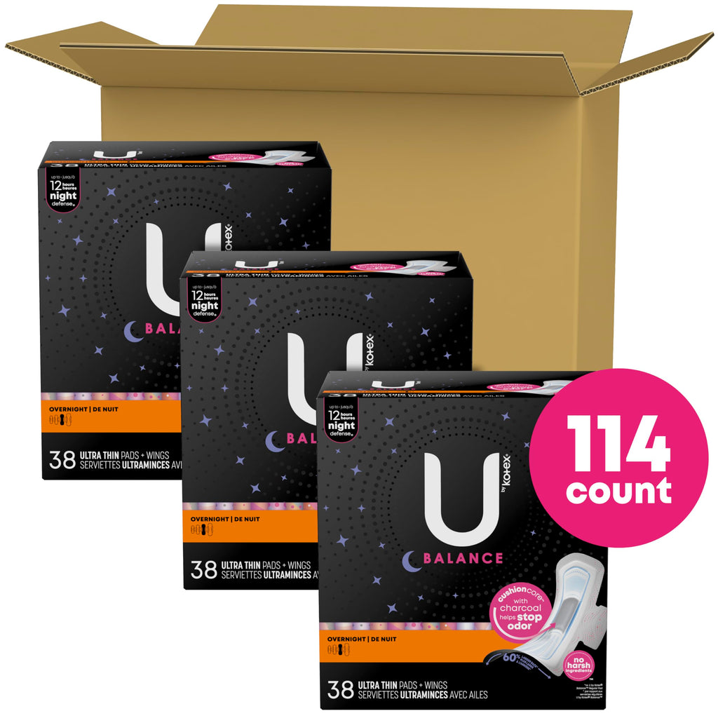 Give yourself a period pad designed for all-night protection with the U by Kotex Balance Ultra Thin Overnight Pads with Wings. Each overnight pad has a 60% larger back* for 360 protection in any position. Our menstrual pads also provide up to no back leaks for up to 12 hours of Night Defense, so you can focus on getting a good night's rest no matter how you sleep. Plus, U by Kotex's unscented pads are dermatologist-tested to be gentle on skin, infused with 100% plant based charcoal and contain no harsh ingredients (made without pesticides, fragrances, lotions, natural rubber latex and elemental chlorine). These sanitary pads feature U by Kotexs raised CushionCore that not only absorbs instantly for up to 100% leak-free protection, but also helps stop odor. The pads design fits and flexes with your body to deliver outstanding skin comfort, while the wings secure the pad in place throughout the night. U by Kotex's feminine pads are individually wrapped, so you can take them with you wherever you go. For period protection during the day, try U by Kotex Balance Ultra Thin Pads. U by Kotex feminine products are FSA/HSA/HRA-eligible in the US. Packaging may vary from images shown. (*vs. U by Kotex Balance Ultra Thin Regular Pad)