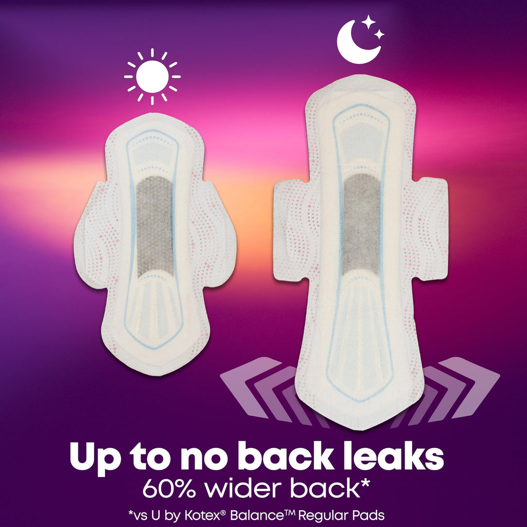 Sleep comfortably with an overnight period pad that provides long-lasting nighttime protection with U by Kotex Balance Overnight Pads with Wings. Each overnight feminine pad has a 60% larger back and front for up to zero front, side or back leaks, so that you can experience 360-degree protection no matter how you sleep. Additionally, our pads with wings are designed with a raised center that absorbs 2x faster. The raised center absorbs quickly for up to 100% leak free protection and helps to lock away blood, sweat and odor to help maximize your comfort. On top of that, our menstrual pads are dermatologist tested to be gentle on skin. These pads are pH-balanced and made without fragrance, lotions, pesticides, parabens, elemental chlorine and natural rubber latex. To help you sleep without worry, our nighttime period pads provide up to 12 hours of night defense. Designed to fit your bodys curves, our overnight pads with wings help eliminate gaps and prevent leaks while providing outstanding skin comfort to help you sleep comfortably through the night. Each overnight pad with wings is individually folded and wrapped to protect your pad with easy, convenient access. For excellent daytime protection, try U by Kotex Balance Ultra Thin Pads. U by Kotex feminine pads are FSA/HSA/HRA-eligible in the US. Packaging may vary from images shown. (vs. the leading unscented foam pad) (vs. U by Kotex Balance Regular Absorbency Pads)