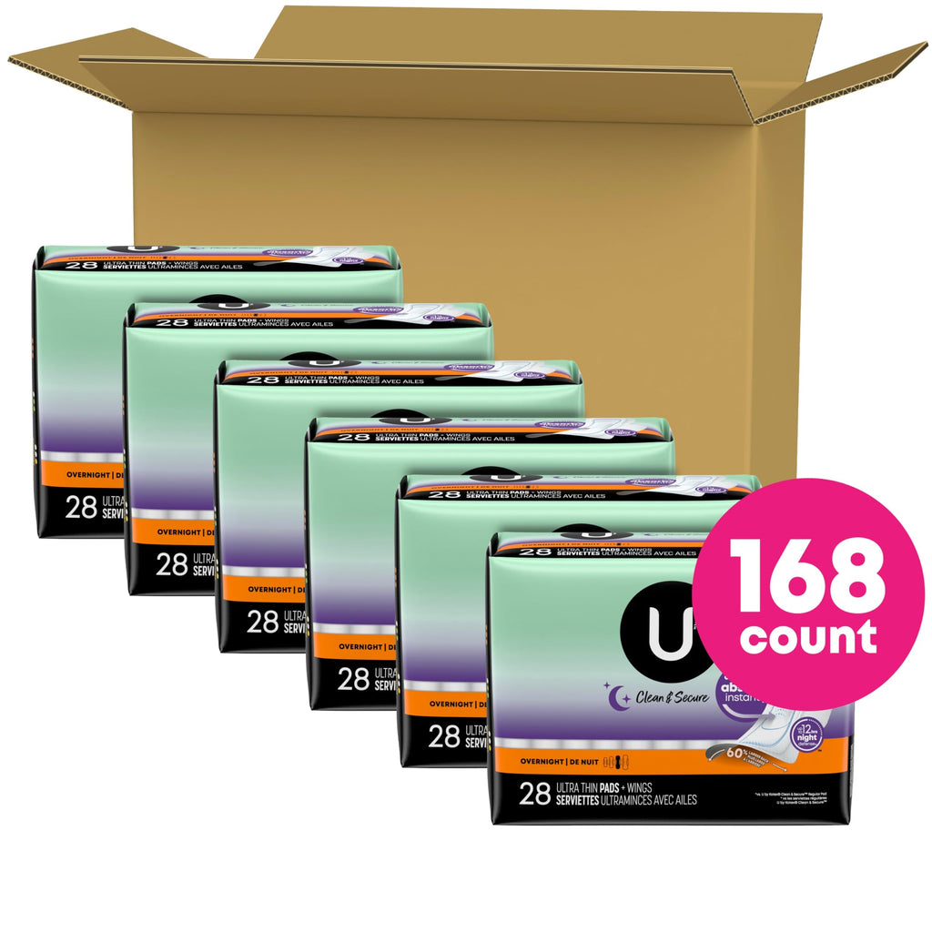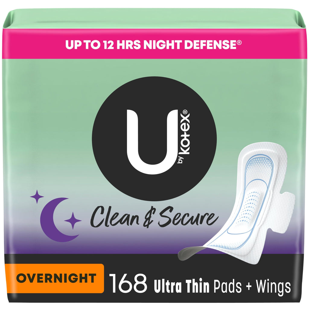 Rest easy tonight with a pad thats designed to deliver more coverage*: the U by Kotex Clean & Secure Ultra Thin Overnight Pads with Wings. These feminine pads are crafted with a raised CushionCore that fits close to your body and absorbs instantly for up to 100% leak-free protection. They also feature a 60% larger back** that absorbs instantly for up to 12 hours of overnight protection, so you can be comfortable no matter how you sleep. Tough on leaks but gentle on skin, these sanitary pads are made with a cottony, soft-touch cover for extra comfort. These pads with wings are hypoallergenic, dermatologist-tested and made without fragrances, lotions, elemental chlorine, pesticides and natural rubber latex. With U by Kotex Clean & Secure Ultra Thin Period Pads with Wings, you can focus on getting a good night's rest, and not on your period. For daytime period protection, try U by Kotex Clean & Secure Ultra Thin Pads. U by Kotex feminine products are FSA/HSA/HRA-eligible in the US. Packaging may vary from images shown. (*vs the Leading Mainline Ultra Thin Size 4 Pad) (**vs. U by Kotex Clean & Secure Ultra Thin Regular Pad)