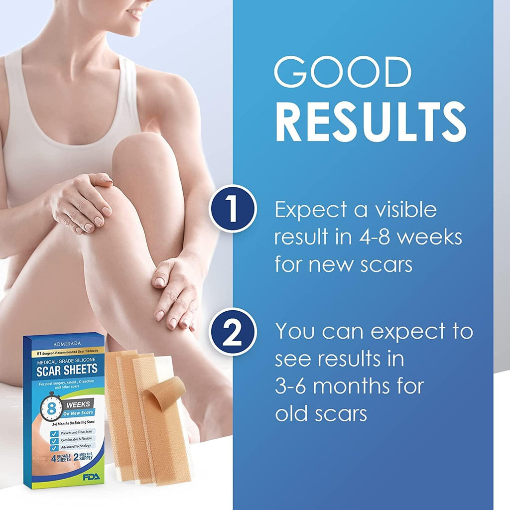• Q: How long should I use the silicone scar sheets for best results? A: For optimal results, it is recommended to use the silicone scar sheets for at least 2 months, applying them consistently for a minimum of 12 hours a day.