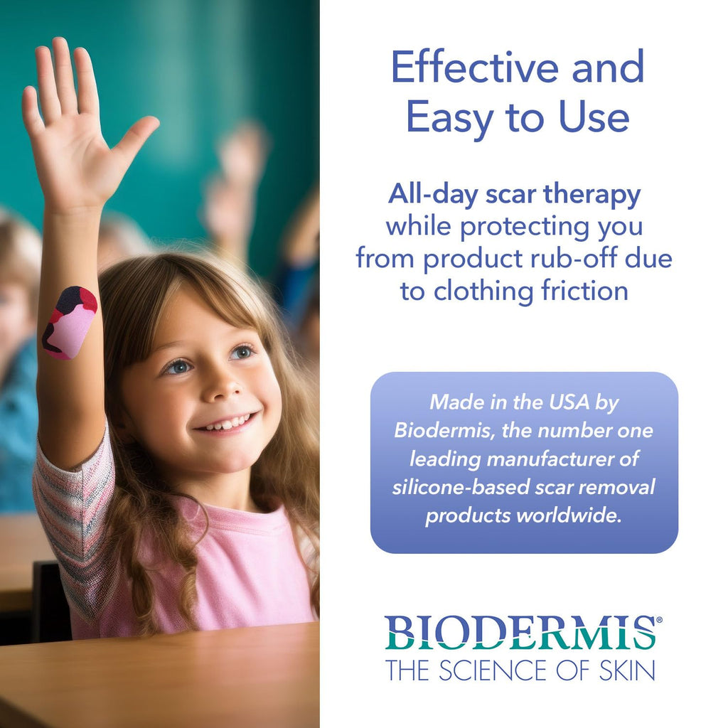 Introducing Biodermis' Silicone Scar Strips, the most comfortable silicone sheeting in the industry. These small fabric-backed silicone strips are ideal for managing any small scars, including those from trauma, burns, basal and squamous cell removal, mole removal, and much more. Our silicone scar sheets are available in Pink CAMO or Green CAMO, adding a fun camouflage pattern that is enjoyable for kids of ALL ages! These silicone scar sheets are significantly thinner than competitors, allowing them to conform precisely to body contours for optimal scar care. Our Silicone Scar Strips help to reduce, flatten, fade, and smooth scars both old and new. They are ideally dimensioned for a variety of small scars, making them an excellent choice for scar patches for surgical scars or silicone patches for scars after surgery. Biodermis' Silicone Scar Strips are also a great option for c-section scar silicone strips, helping to diminish the appearance of post-surgical scars. Trust in Biodermis' Silicone Scar Strips for your scar-care needs, and see the difference they can make in your scar-care journey.