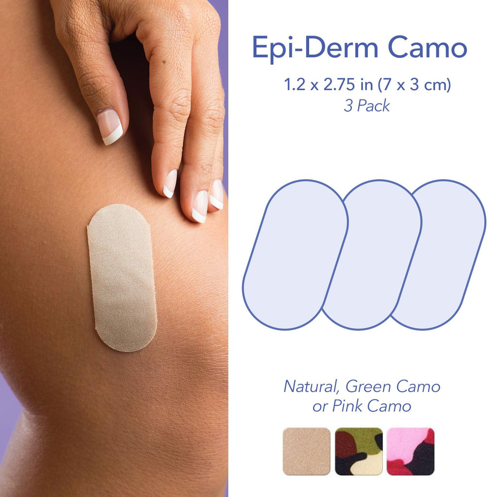 • Q: What designs are available for the silicone scar sheets? A: EpiDerm silicone scar sheets are available in several designs including natural, green camo, and pink camo to add a touch of personality.