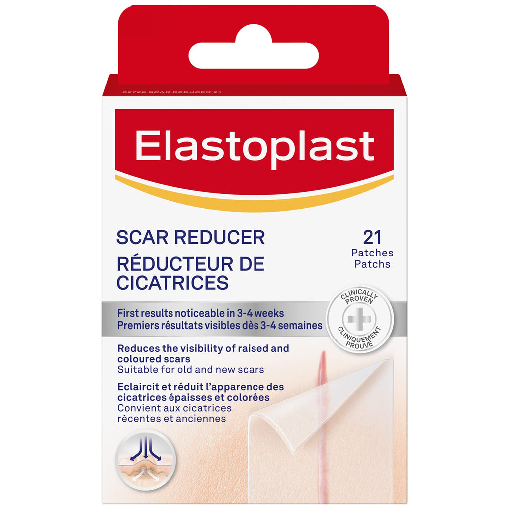 Elastoplast Scar Reducer Plasters - a convenient and efficient way to reduce raised and coloured hypertrophic scars or keloids.Elastoplast Scar Reducer is effective in the case of raised and coloured hypertrophic scars and keloids. Scars become flatter, lighter and softer. Elastoplast SCAR REDUCER can be used for both new and old scars, on the face or on the body. The first results are noticeable after 3 to 4 weeks. Can be used for both new and old scars. Clinical studies have shown positive results after 8 weeks of consecutive use of at least 12 hours a day*. Using the patch for longer than 8 weeks may further improve the appearance of the scar. Results may vary from person to person and from scar to scar.Application: Treatment can be started as soon as the wound has completely closed and healed and after sutures have been removed in the case of surgical intervention. Elastoplast SCAR REDUCER can be used for both new and old scars, on the face or body. 1. Remove the protective paper from the adhesive side of the patch. 2. Apply the patch on clean and dry skin, making sure that the scar is completely covered. If the scar cannot be completely covered, several patches can be applied next to each other. For smaller scars, patches can be cut to the desired size. 3. Wear for a minimum of 12 hours a day and change the patch daily.Product benefits:Discreet transparent patchFlexible and breathable material for high wearing comfortEasy-to-use, can be cut to sizeWater-resistantVery skin-friendly* For single use only - for each application use a new patch to retain the product described effect.