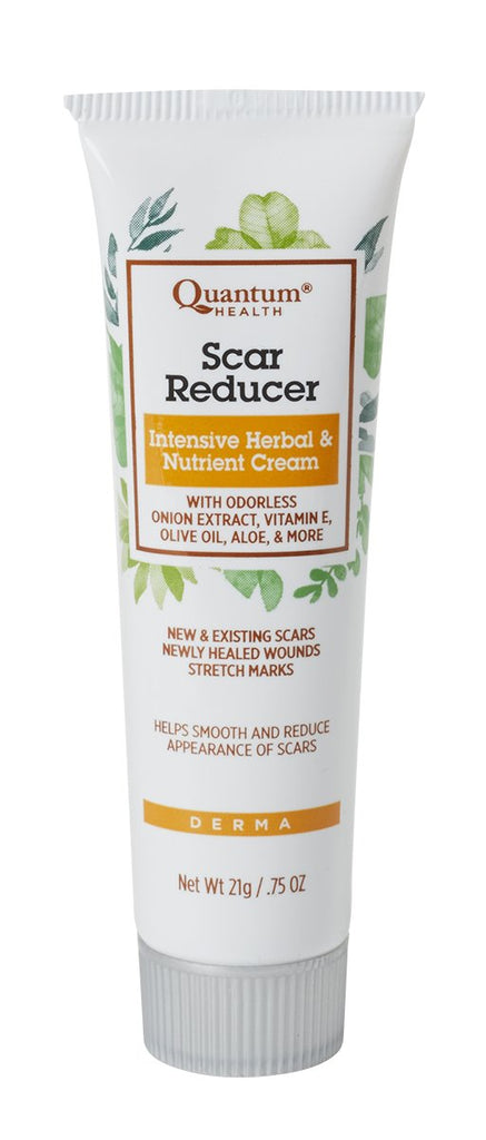 Quantum health scar reducer herbal cream helps smooth and reduce the appearance of new and existing scars. This intensive herbal & nutrient cream is formulated with onion extract, lysine, vitamin e, tamanu oil, allantoin and other nutrients. Our fragrance-free cream helps to diminish the appearance of stretch marks, calluses, scar tissue and other skin hardening with a unique blend of vitamins, botanicals and other topicals. This cream comes in a 21 gram package.