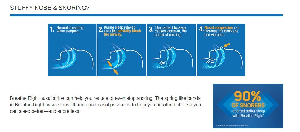 Breathe Right nasal strips open your nasal passages to reduce or even stop snoring and nasal congestion due to: Cold Allergies Deviated Septum Breathe Right nasal strips are clinically proven to relieve nasal congestion, helping you breathe better so you can sleep better; made of flexible, spring-like bands that fit right above the flare of the nostrils. A sticky adhesive is used to lift the sides of the nose and open the nasal passages, making it easier to breathe for a more restful night of sleep