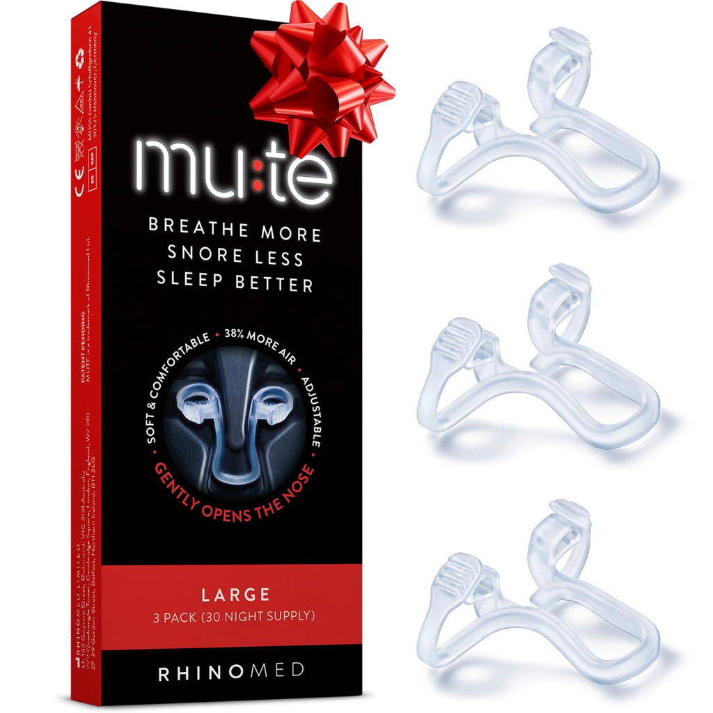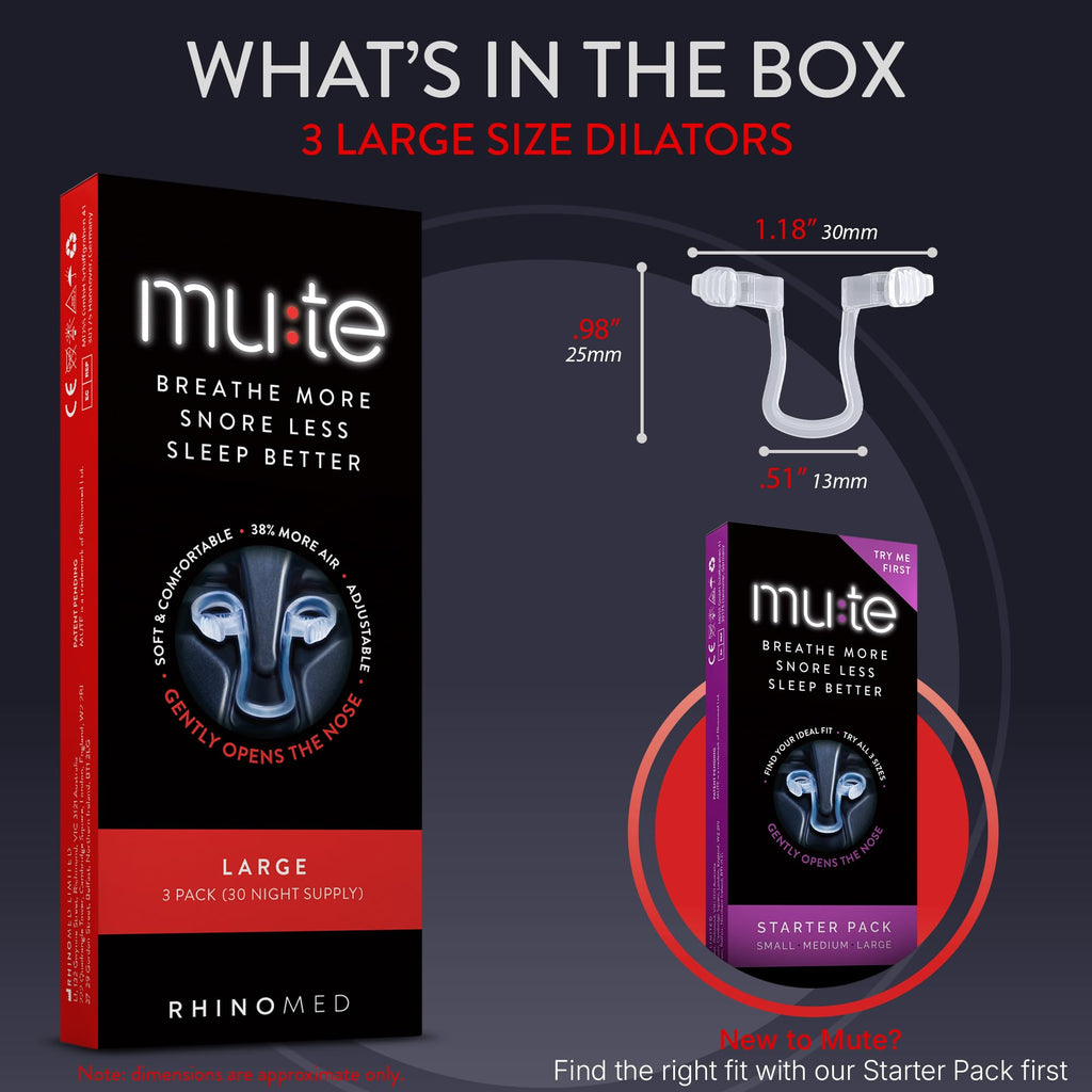 The Rhinomed Mute Nasal Dilator for Snoring Reduction is a soft, pliable polymer stent that dilates your nose. Mute increases the volume of air travelling through the nose during sleep, encouraging nasal breathing to alleviate congestion - factors critical to help stop snoring and for a better quality of sleep. Mute has been proven in clinical trials to increase air flow through nasal passages, on average, up to 38% over nasal strips. Made from ultra-soft medical grade bio-compatible polymers conforming to the strictest medical standards, Mute stays in place throughout the night. Mute comes in three different sizes, and each device has individually adjustable left and right stents to further refine the fit. We recommend first buying the assorted size pack, which includes one of each size, to help determine which size offers the best fit for you. Mute nasal dilator units can be reused approximately ten times. FDA registered.