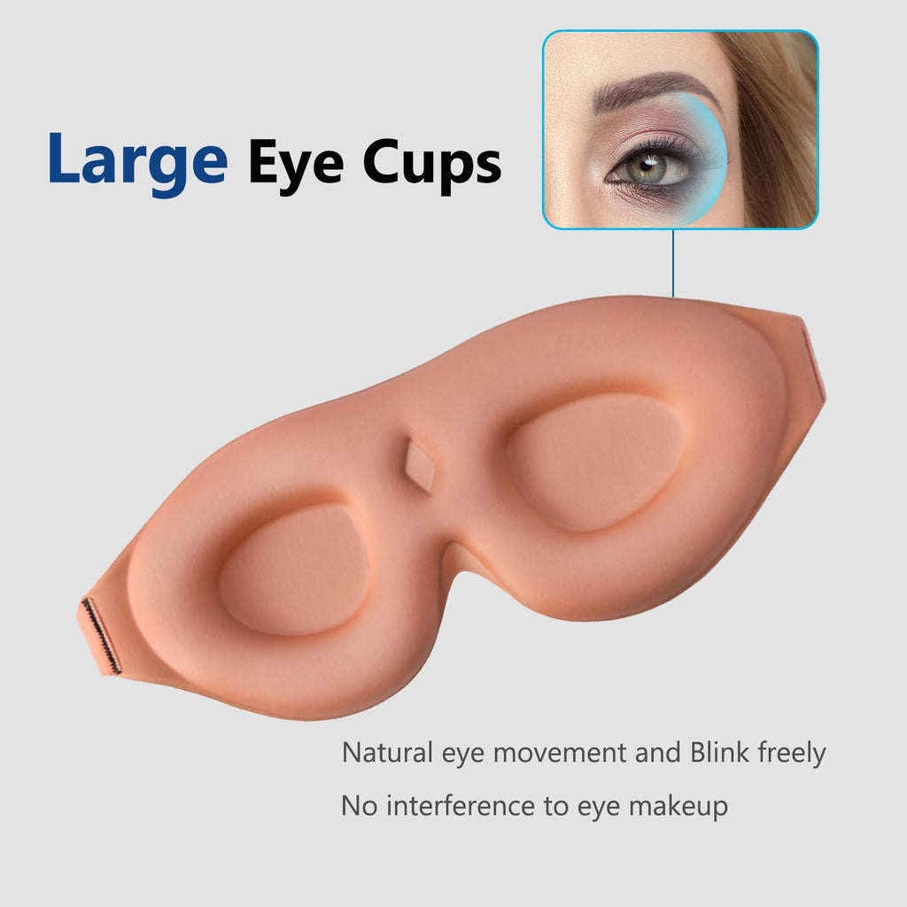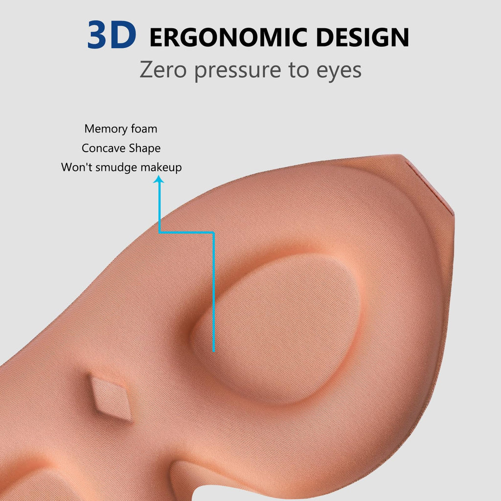 • Q: How does the ergonomic design of the sleep mask benefit users? A: The ergonomic 3D contoured design features larger and deeper eyecups that allow natural blinking and prevent rubbing against the eyes or eyelashes.