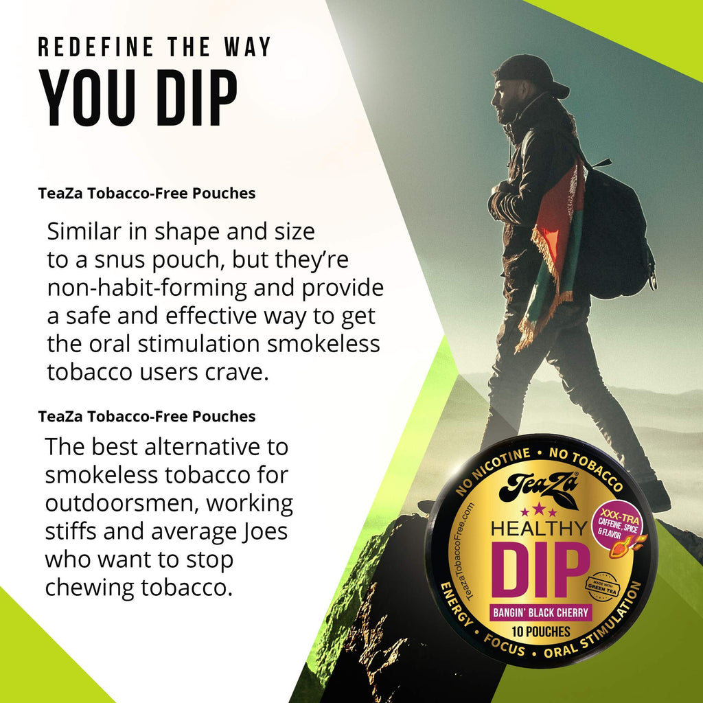 Chewing Tobacco Alternative Have More Energy - Bangin' Black Cherry. Unlike other dip varieties, TeaZa Bangin' Black Cherry pouches contains a small amount of natural caffeine, which helps provide no crash. Tobacco Free Pouches are power-packed with herbs and vitamins including green tea, ginseng, and B-vitamins plus they are Tobacco-free, Nicotine-free, Gluten-free, nut-free and vegan. TeaZa Energy Pouches were originally designed to help smokeless tobacco users kick their habit because Quitting tobacco can be a long and difficult process, and our alternative tobacco pouches are a healthier option than chewing tobacco.