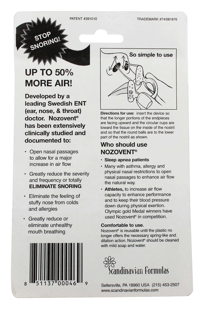 • Q: What is the Scandinavian Formulas Nozovent Anti-Snoring Device? A: The Scandinavian Formulas Nozovent Anti-Snoring Device is a safe and easy-to-use product designed to reduce snoring, improving overall sleep quality.