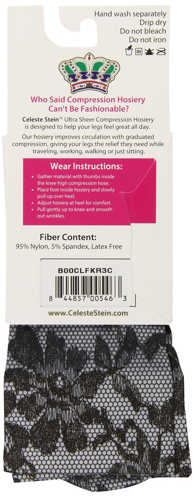 DescriptionTherapeutic compression socks. Graduated compression at 3 points, with concentration at the ankle. Printed and fashionable, one size fits most women shoe sizes 5-11. Helps reduce pain from varicose veins. Improves circulation of blood flow. Gives your legs relief while you, walk, work, travel or sit. Easy to put on and take off nylon/spandex blend. Fits calf size up to 15''