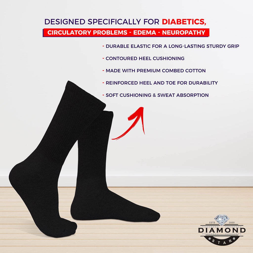 DESCRIPTION:? Health, safety, and comfort are made with our superior non-binding and non-elasticated diabetic socks, they are carefully and responsibly designed to never constrict the foot or leg.? Premium Super Soft Cotton with Extra Stretch.Full Cushioned Foot and Smooth Comfort Toe Seaming For Eliminates Pressure Point.? These socks are ideal for individuals living with Diabetes, Arthritis, Edema, Neuropathy, or those who suffer from circulation issues. ? We designed and test our socks to ensure they don't restrict blood and oxygen circulation. Moisture control aids in reducing the risk of infection. ? Comfortable cushioning throughout you with extra softness and protection all-day comfort wherever you go.Pack of 3,6,12 Socks Available in 3 sizes & 6 Colours? 9-11: This size fits for Mens womens shoe sizes 5-10? 10-13: This size fits for Mens shoe sizes for 7-12 ? 13-15: This size fits for Big and Tall Mens Shoe Size: 9-14