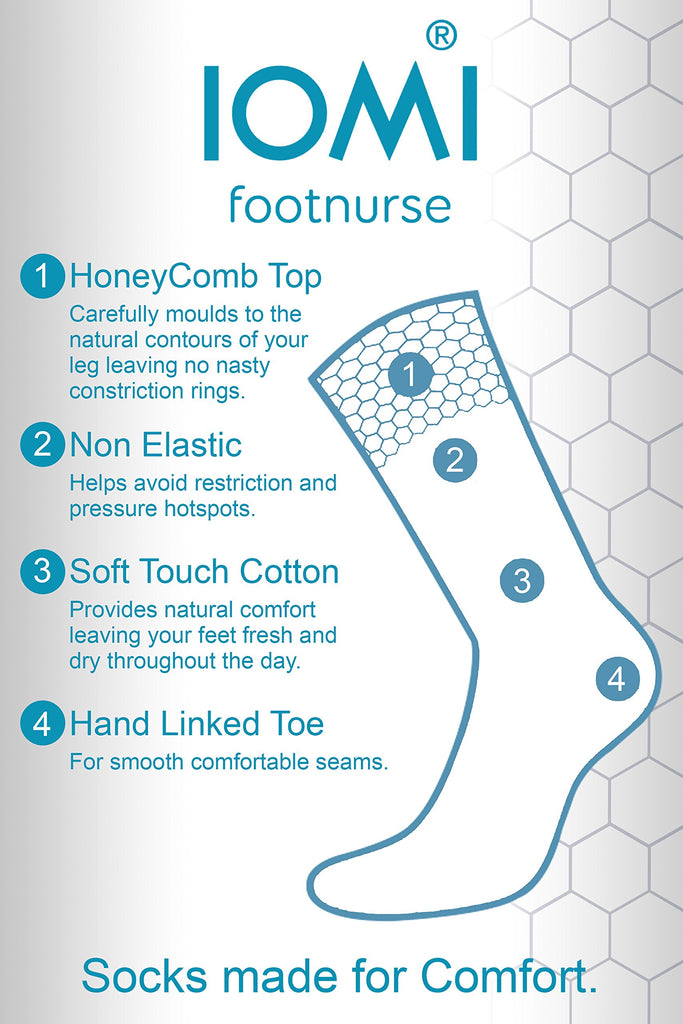 IOMI Gentle Grip Diabetic Socks If you suffer from diabetes it is important to wear the correct socks. Therefore, IOMI footnurse have developed a range of mens diabetic socks carefully constructed using the expertise of IOMI technical specialists. IOMI diabetic socks have four main features that make the socks great for those who suffer from diabetes. Main Features 1. HoneyComb top - Carefully moulds to the natural contours of your leg. The purpose of this means no nasty constriction rings around the contours of your legs, an important factor when wearing socks to aid diabetes. 2. Non Binding - Finely knit plain fabric in the leg and foot which helps to avoid constriction and pressure hotspots. 3. Soft Touch Cotton - Provides a natural comfort for the purpose of leaving your feet fresh and dry throughout the day. 4. Hand Linked Toe - For smooth comfortable seams, essential to facilitate comfort for diabetics and prevents sourness. IOMI is a SockShop product and you can trust SockShop for their technical ability and their attention to detail in their products. IOMI diabetic socks are available in 5 colours in the mens range, they are a size 7-12 US and are machine washable at 40 degrees. Extra Product Details * IOMI footnurse * Available in 5 colours * 6 pair pack * Size 6-11 UK 39-45 eur 7-12 US * Machine washable * Designed specifically for diabetics * Carefully constructed HoneyComb top * SockShop Gentle Grip top using SockShop expertise * Non-binding to avoid restriction rings and pressure hotspots * Made with super combed cotton * Soft touch feel * The essential hand linked toe * 77% cotton 19% polyester 3% nylon 1% elastane * Search for other IOMI footnurse products in our amazon store.