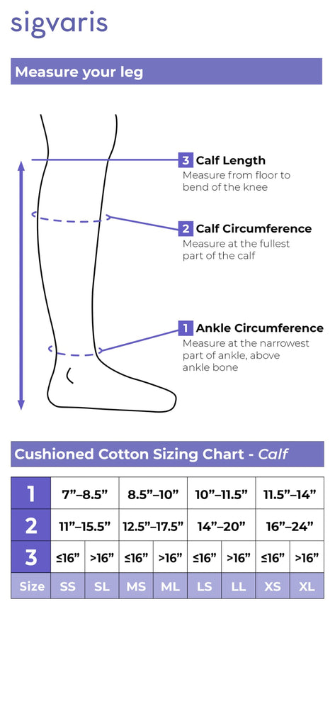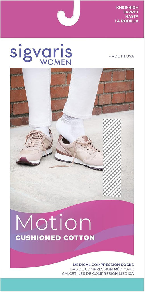 Sigvaris Cushioned Cotton knee high compression socks are designed with a cushioned sole, heel, and toe area for ultimate comfort and to protect feet. The flat, low-friction toe seam is ideal for everyday wear and sensitive skin. The Sigvaris Motion collection is best suited for mild and moderate symptoms and are diabetic friendly for sensitive skin.How does graduated compression therapy help with the management of venous problems?As a person walks, the contraction and relaxation of the calf muscles around the veins aid in moving blood toward the heart. The external graduated compression of Sigvaris socks and stockings act as a layer of muscle by gently squeezing the stretched vein walls together, allowing the valves to close. The cavity of the vein is reduced, thereby restoring blood flow to a normal state and aiding overall circulation.By compressing the limb with graduated compression - strongest at the ankle and decreasing going up the leg - the compression stocking helps the venous return, decreases venous pressure, venous stasis, reduces edema and management of venous walls, and relieves aching and heavy legs by aiding the body in moving blood up the leg, against the pull of gravity. To be most effective, these socks should be put on at the start of the day and removed before going to bed. About Sigvaris: Sigvaris compression solutions help you to go easily through your day, feeling strong and secure.