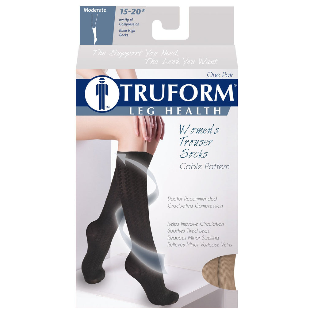 Product DescriptionTruform 1975 trouser socks are designed to help energize the legs and reduce discomfort. Microfiber nylon on this collection's various patterns are incredibly soft and breathable to help keep you cool. Attractive designer-knit delicate patterns make these socks an excellent choice for both business and casual wear. Truform graduated compression support hosiery at a moderate 15-20 mmHg compression helps maintain positive circulation and leg health. Ideal for nurses, those experiencing varicose veins, and those expecting long flights or extended periods of sitting or standing.Manufacturer Contact Information3960 Rosslyn Dr, Cincinnati, OH 45209