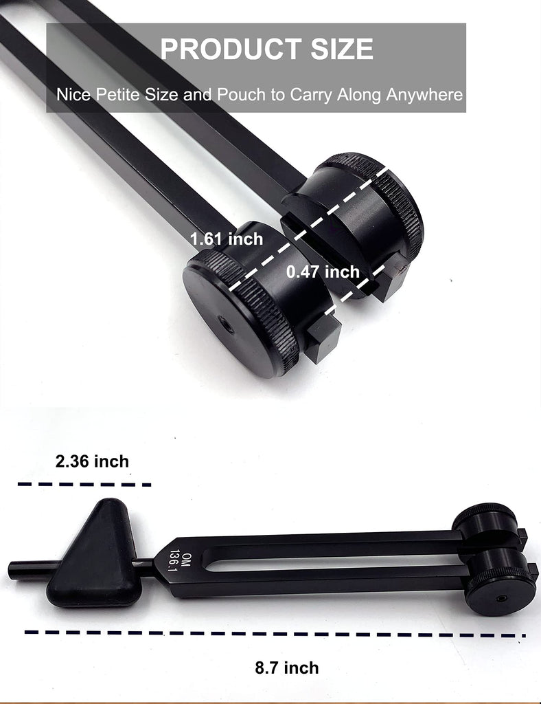 Features -Delivers clear tone, longer sound and accurate tuning. -Produces sedative, and can effectively relieve the frequent headaches and quickly adjust the mood. -Improve learning concentration;Quick send negative emotions, improve insomnia, promote positive energy. -Helps to reduce stress and relieve joint pain and stiffness. How to use? Ear to listen, or in the chest, neck and spinal cord, head, such as on the location of the foot reflection zone directly to vibrate, centering effectively, build a stable energy center, make energy rooted. Package included 1*OM 136.1 Hz Tuning Fork 1*Silicone hammer 1*Cleaning cloth 1*Triangular silica gel 1*Soft Storage Bag Specifications Name: OM136.1 Hz Tuning Fork Material:Aluminum alloy Color: Black Size:about 8.7inch*1.75inch (22cm*4.5cm) Net Weight: About 0.45 pounds Notes 1. To keep the sound of the tuning fork more accurate, please do not tap it with metal, use the attached striker to tap. 2.Please remember to clean the tuning fork with the attached microfiber cleaning cloth after each use, and store it in a dry storage bag. 3.Keep the wooden striker dry and away from sunshine. 4.If you have any questions OR advises about product, please contact us, our customer service team is always stand by to serve for you. 5.We will develop more products in the future, if you have any suggestions, please let us know by amazon message.