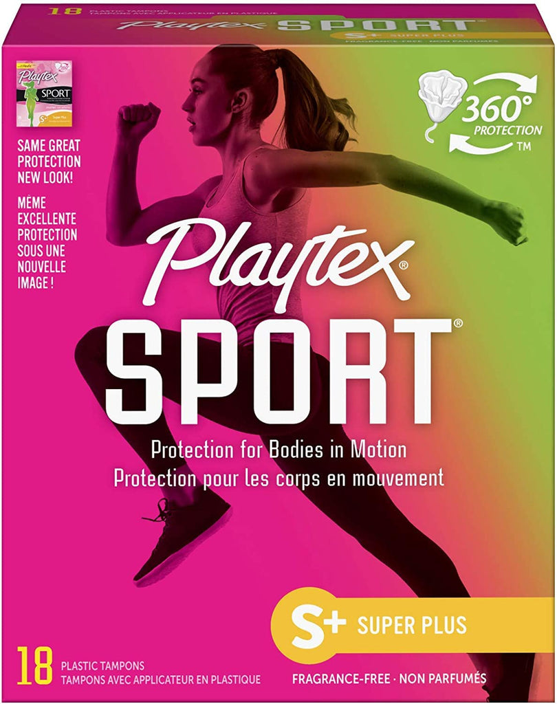Same great protection. New look! 360 Degrees Protection. Protection for bodies in motion. Fragrance-free. Absorbency: Light; Absorbency Range: Less than 6g; Absorbency: Regular; Absorbency Range: 6-9 g; Absorbency: Super; Absorbency Range:9-12 g; Absorbency: Super Plus; Absorbency Range:12-15 g. The absorbencies of tampon brands have been standardized. Use this chart to compare Playtex tampon absorbencies to other brands. Select the minimum absorbency needed to control your menstrual flow in order to reduce the risk of getting TSS. Designed to fit your body and its every move. A protective leakage barrier so you can play on! Flex-Fit: Flexible interlocking fibers work quickly to trap leaks. Leak Defense: Anti-leak back up layer for extra protection. Contoured Tip & No-Slip Grip Applicator: For comfortable, precise placement. Return box and unused tampons if you have concerns. www.playtexplayon.com. www.playtexplayan.ca. Consumer Relations: 1-877-4Playtex (1-877-475-2983). Made in U.S.A. of imported materials.
