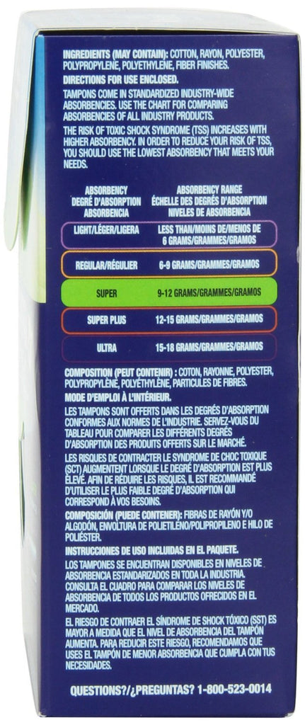 Built-in backup. Unique braid - an extra layer of protection to help stop leaks before they happen. FormFit protection gently expands to fit your unique shape. Easy to use. Smooth applicator. Easy-open tabs. Anti-slip grip. Get up to 8 hours of protection. Tampons come in standardized industry-wide absorbencies. Super: 9-12 grams absorbency range.