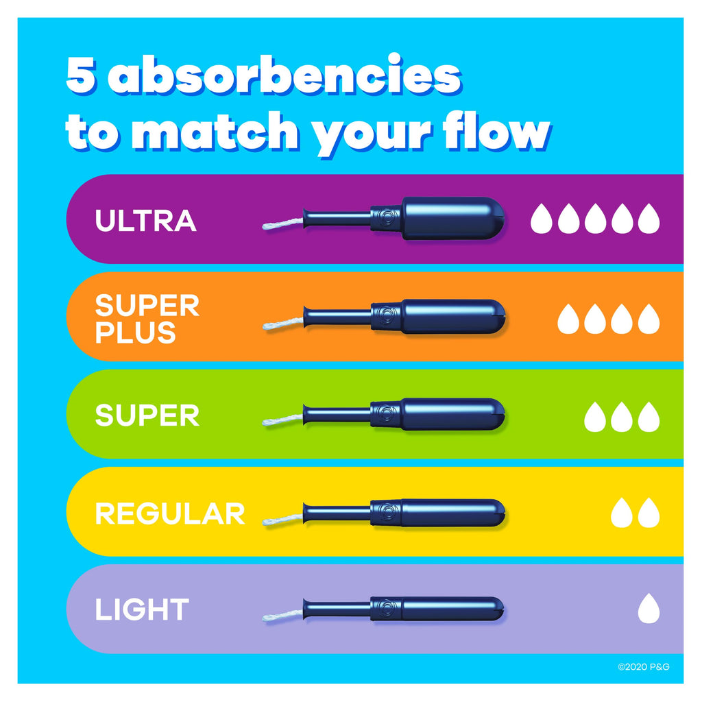 Only Tampax Pearl tampons come in five different absorbencies, so you can move up or down to find what's right for you. Your flow is different every day, so your tampon should be, too. Whatever their absorbency, all Tampax Pearl tampons feature a LeakGuard braid that helps stop leaks with a core free of dyes*. Their FormFit design gently expands to your individual shape, while their smooth removal layer ensures amazing comfort.Tampax Pearl Regular Absorbency tampons are free of perfume and chlorine bleaching, and clinically tested to be gentle on skin. Choose the level of absorbency thats best for you and your flow, and consider switching between different absorbencies during your period. Find your flow combo with Tampax Pearl.*Braid has skin-friendly pigments.