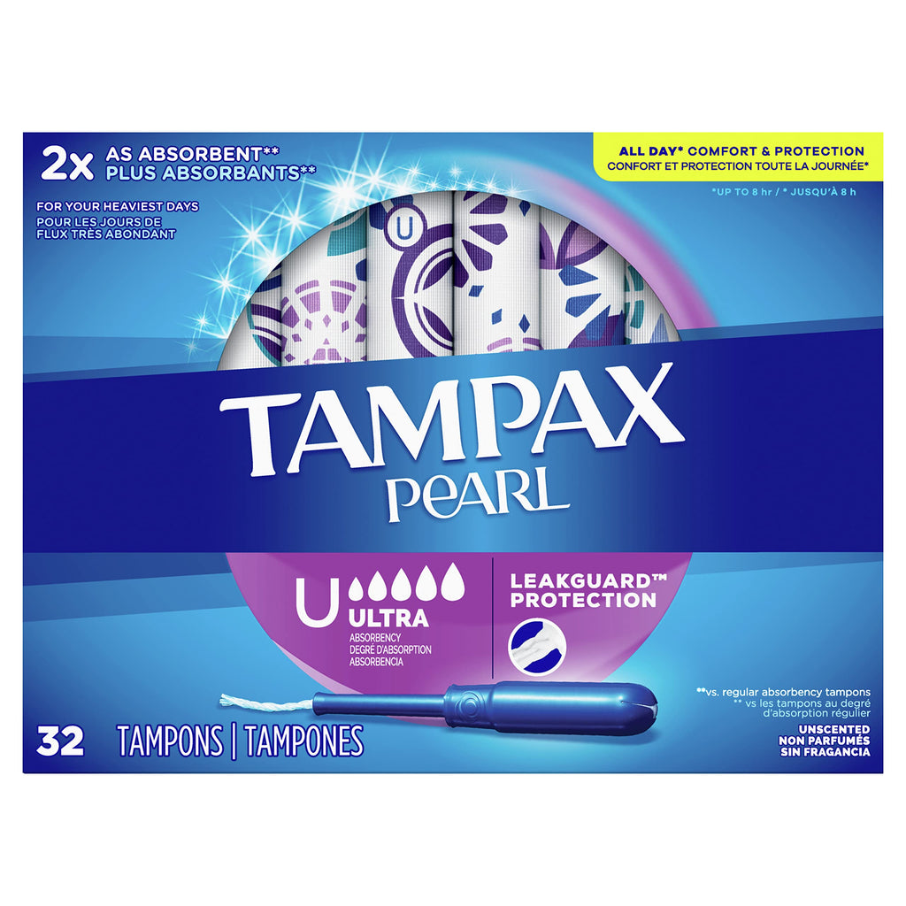 Only Tampax Pearl tampons come in five different absorbencies, so you can move up or down to find what's right for you. Your flow is different every day, so your tampon should be, too. Whatever their absorbency, all Tampax Pearl tampons feature a LeakGuard Braid that helps stop leaks with a core free of dyes. Their FormFit design gently expands to your individual shape, while their smooth Removal Layer ensures amazing comfort. Tampax Pearl ultra absorbency tampons are free of perfume and chlorine bleaching, and clinically tested to be gentle on skin. Choose the level of absorbency that's best for you and your flow, AND consider switching between different absorbencies during your period. Find your flow combo with Tampax Pearl. Braid has skin-friendly pigments.