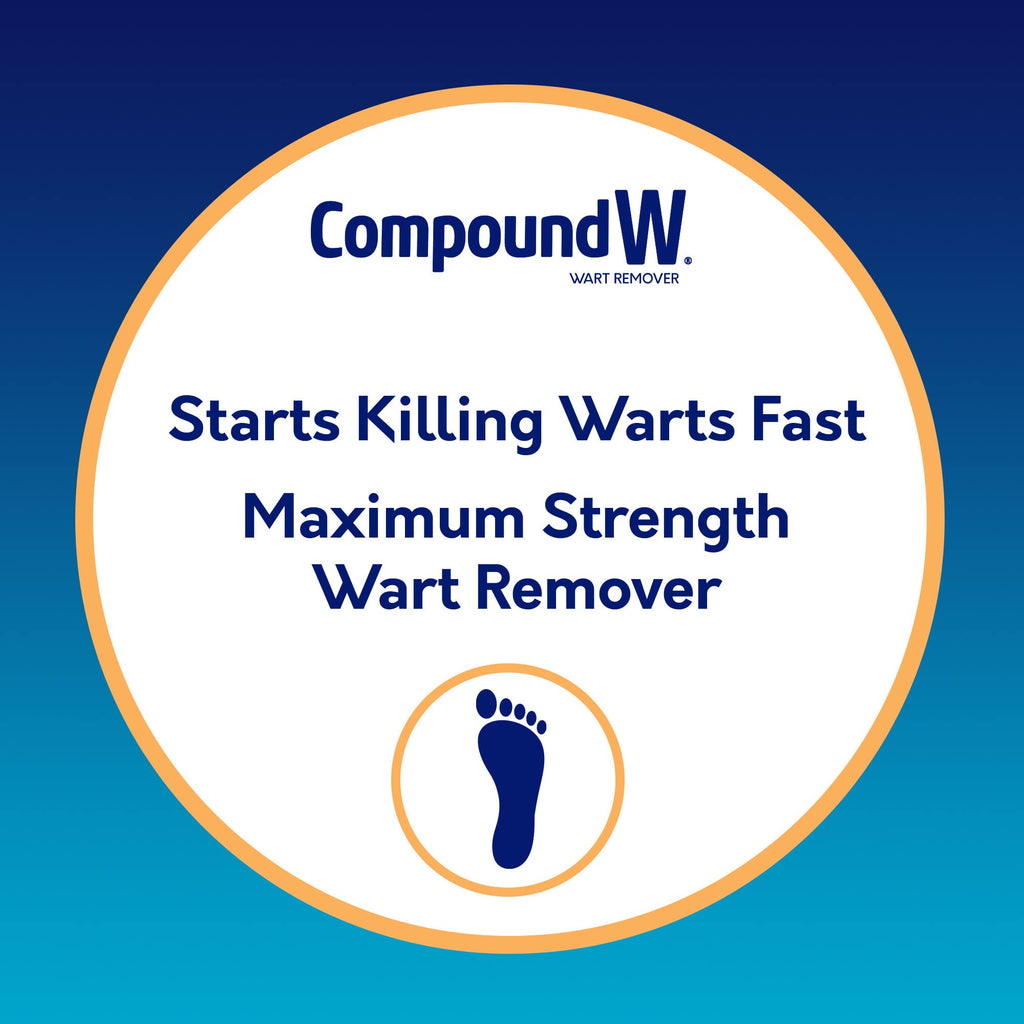 Treat your plantar wart at home! Compound W Maximum Strength One Step Plantar Foot Pads easily and effectively remove uncomfortable plantar warts. From the #1 most trusted and dermatologist recommended wart removal brand*, the cushioned and waterproof self-adhesive pads conceal, treat and protect plantar warts comfortably with concentrated salicylic acid. One Step Foot Pads provide the maximum strength wart remover without a prescription and feature 3-in-1 wart removal protection: treats, cushions and conceals. Safe for use by adults and children 3 years of age or older. *National Consumer Panel 52 Week Data: 1/28/2018, 1/27/2019, 1/26/2020 and IQVIA Claim Substantiation Validation Statement, 12/11/18 - 11/30/19.