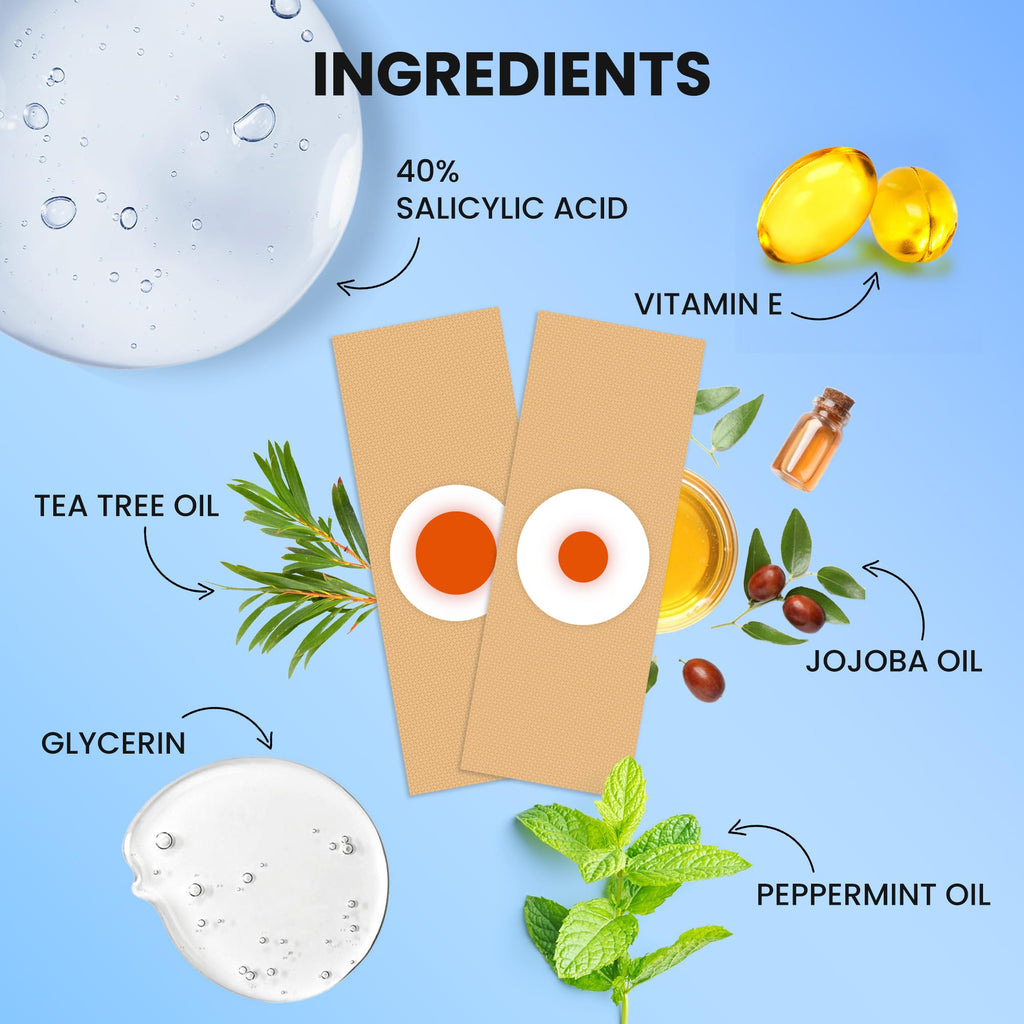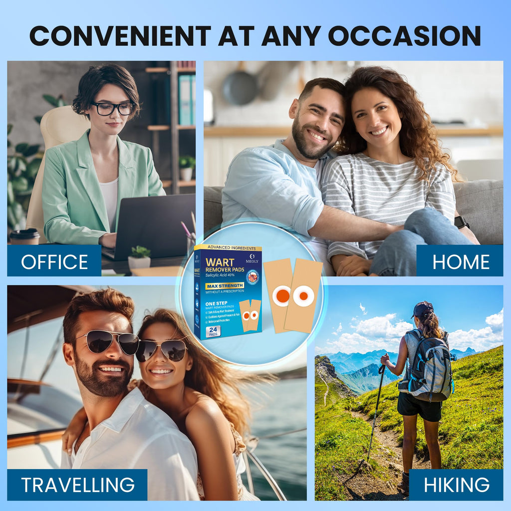 MEOLY 40% Salicylic Acid Plantar Wart Corn and Callus Remover Pads: Effective and Safe Treatment for Warts, Corns, and Calluses. Each pack includes 36 pads in two sizes, along with 15 PU films to secure the pads in place for continuous removal action.
