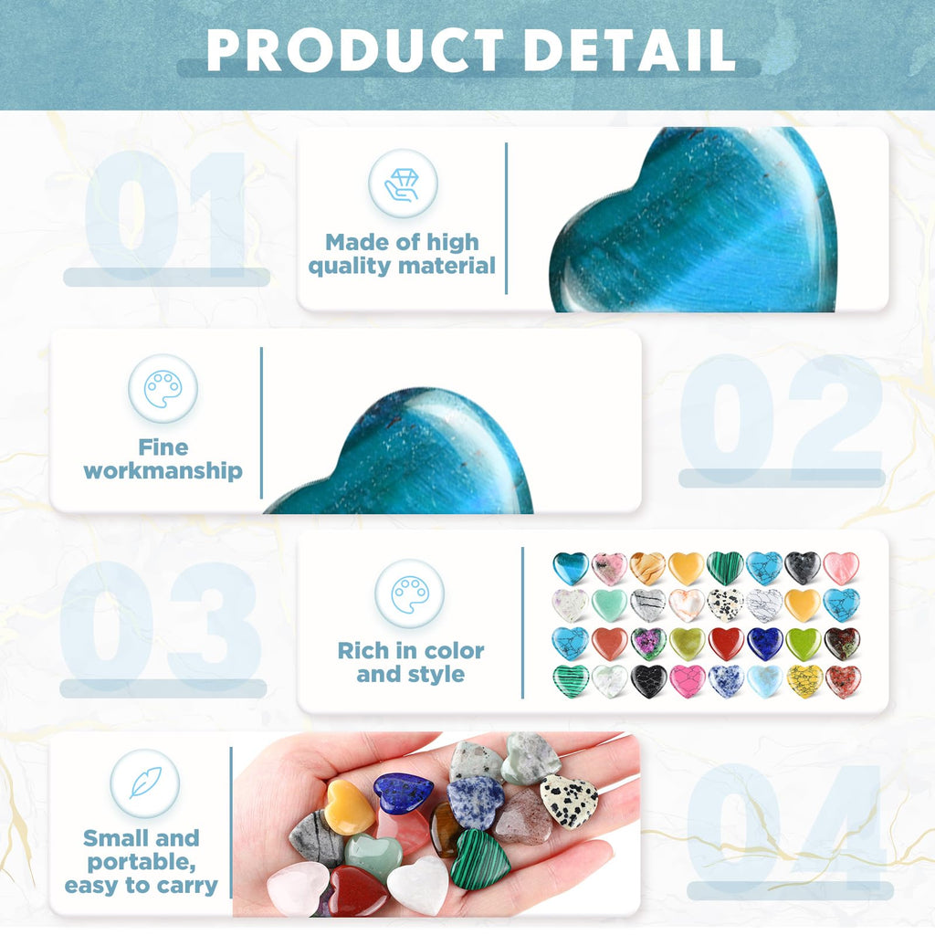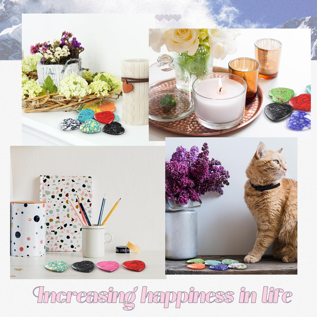 Features: Mixed styles: These heart shaped worry stones will be shipped randomly, so that you have no idea of what patterns you will receive, which is surprising and exciting. Sweet gift choice: You can gift these heart shaped stones to your family members, relatives, close friends, classmates and colleagues on various occasions, to express your love and care. They will be impressed and delighted to receive such delicate accessories. Specifications: Color: multicolor Size: approx. 1.38 x 1.38 x 0.24 inches/ 35 x 35 x 6 mm Package includes: 40 x Heart shaped crystal stones Notes: Manual measurement, please allow slight errors on size. The color may exist a slight difference due to different screen displays. Small items, please keep away from little kids to avoid choking risks.