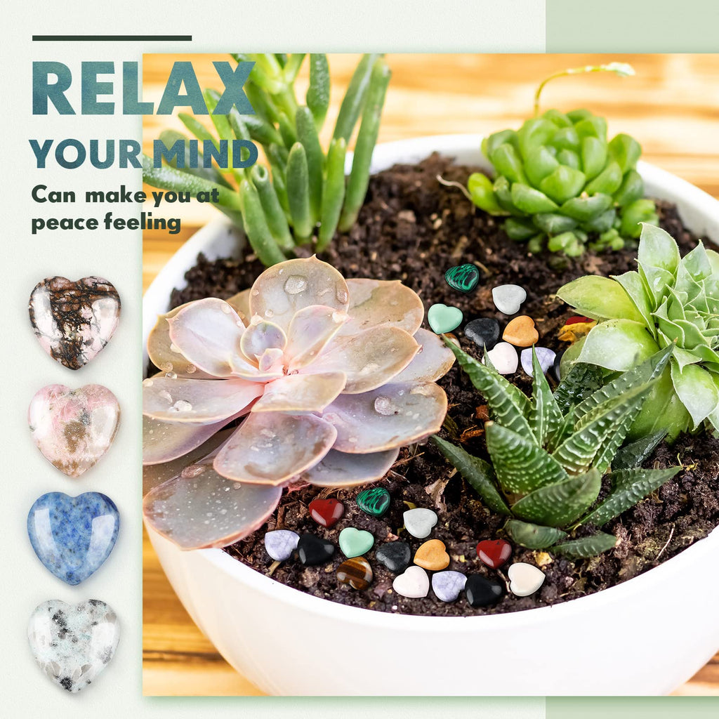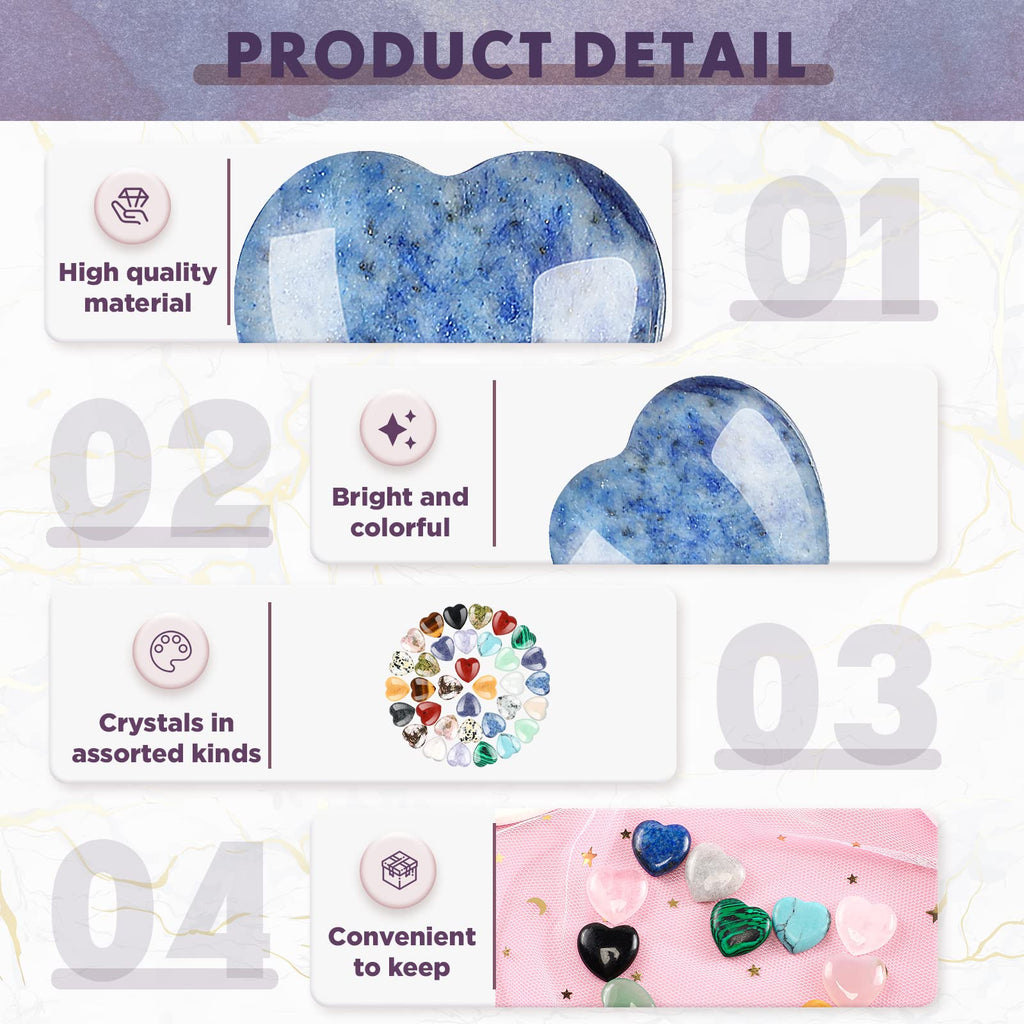 Features: Relief your stress: The quartz worry stone will be a nice helper to relax your mind and release your negative energy to regain lost energy in your body by providing a nice touching. Suitable Occasions: These rose quarts crystals are suitable for all kinds of clothing styles and makeup to make you look more beautiful. Also suitable for any occasion, wedding, dating, party, birthday and more. Specifications: Material: stone Color: multiple colors Size: 20 x 20 x 6 mm/ 0.8 x 0.8 x 0.2 inch Quantity: 72 pieces Package includes: 72 x Heart crystal stones Notes: Manual measurement, please allow slight errors in size. The color may exist a slight differences due to different screen displays.