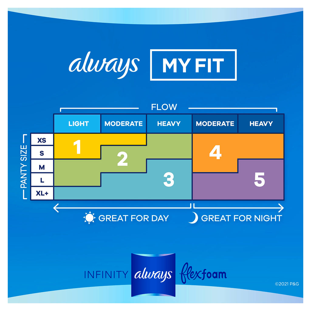 Try Always Infinity FlexFoam for a pad that feels like nothing and protects like nothing else! With Always Infinity FlexFoam pads a Zero Leak and Zero Feel period is possible. FlexFoam pads absorb up to 10x their weight. FlexFoam pads are unbelievably thin and flexible, so your pad moves with you, not against you. Zero Feel protection is possible with our driest, breathable top layer, and super absorbent holes that pull wetness away from your skin. Always FlexFoam pads are dermatologically tested, and approved as skin friendly by the Skin Health Alliance. Always products are FSA/HSA Eligible. Always Infinity pads are made with FlexFoam, Not Fluff. With Always Infinity FlexFoam, the holes and slots in the core pull fluid away from your body and distribute it to the bottom of the pad. So, it absorbs more and leaves you feeling drier, for protection that doesnt hold you back. Always Infinity FlexFoam pads offer up to 10 hours of protection, so in between balancing the day's to-do list, you don't have time to question your period protection. In addition, they also have a breathable top layer that keeps you feeling dry all day long, so you can say goodbye to hot and stuffy.