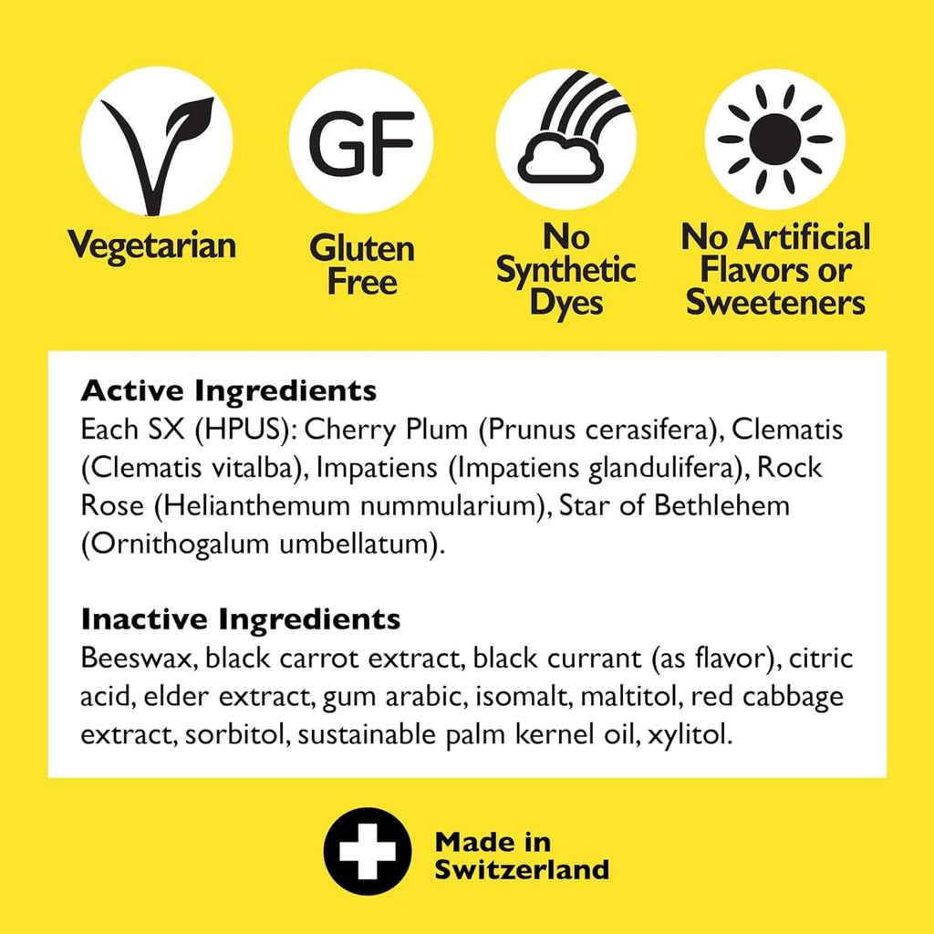 Bach rescue pastilles. Original flower remedies. Natural stress relief. Chewy pastille lozenge. Black currant flavor. Non-habit forming. A trusted brand for over 70 years. Homeopathic.