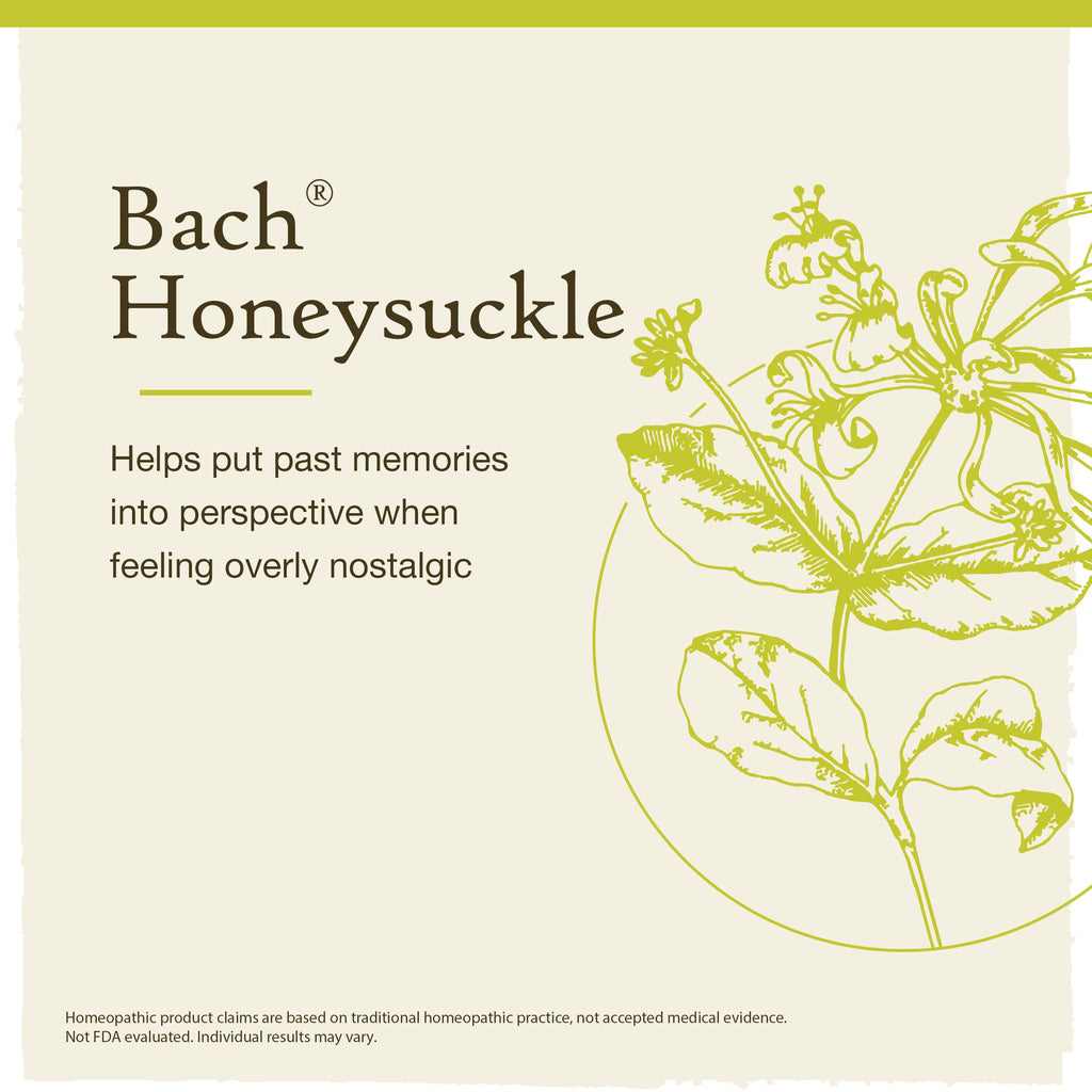 Embrace The Now. The Bach remedy Honeysuckle encourages the positive potential to live in the present and not be held back. The past is what makes us who we are; however, the ability to move forward in life, without regrets, does not always come easy. Reflect and learn from the past, leaving the regret behind.Covered by the Nelsons 45-Day Satisfaction Guarantee. If you are not satisfied with your Bach or Rescue product purchased from its authorized seller, you may request a refund or replacement product. Because Nelsons is unable to control the quality of products sold by unauthorized sellers, unless otherwise prohibited by law, the Guarantee is not available for products purchased from unauthorized sellers. The Guarantee applies only to original, end-user purchaser in the United States. Guarantee claim must be made within 45 days of purchase. You are required to furnish proof of purchase. Nelsons reserves the right to deny guarantee coverage in cases of suspected fraud or abuse.