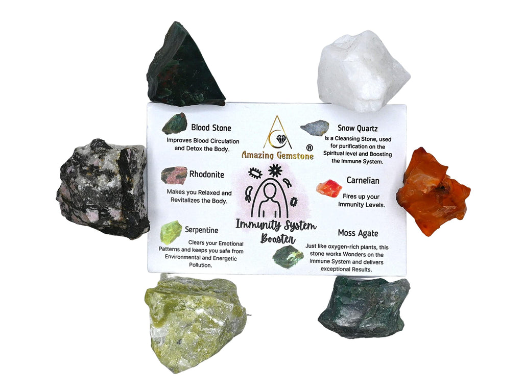 • Q: What is included in the Amazing Gemstone Crystal set? A: The set includes six healing crystals: Blood Stone, Rhodonite, Serpentine, Snow Quartz, Carnelian, and Moss Agate, along with a detailed information card describing the benefits of each stone.
