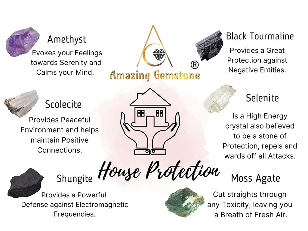 • Q: What are the healing properties of the crystals included in this set? A: This set includes Amethyst, Scolecite, Shungite, Black Tourmaline, Selenite, and Moss Agate, each with unique healing properties. Amethyst is known for its calming effects, Shungite is often associated with purification, and Black Tourmaline is believed to protect against negativity.