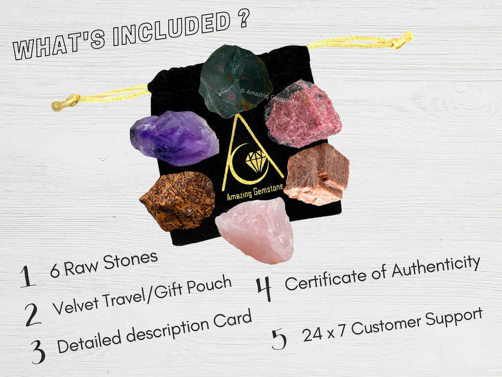 • Q: What healing crystals are included in the set? A: The set includes Blood Stone, Rose Quartz, Peach Moonstone, Mariyam Jasper, and Rhodonite healing crystals.