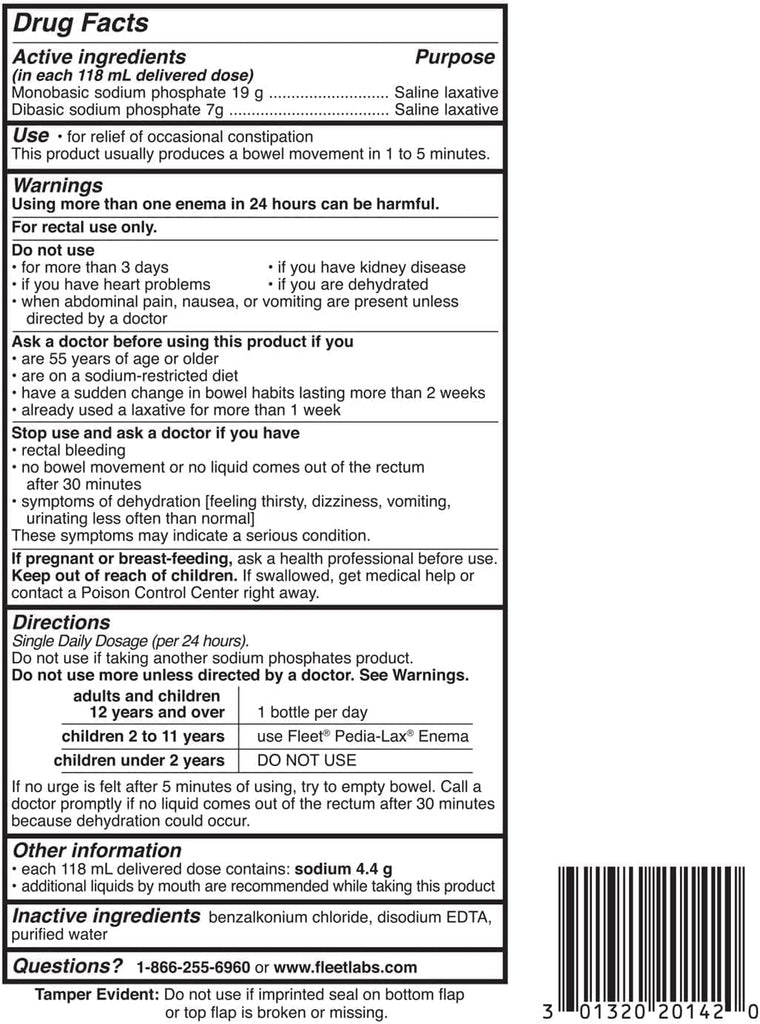 Help alleviate occasional adult constipation with Fleet Saline Enemas. They feature a soft, pre-lubricated Comfort tip for easy insertion and have 25 percent more lubrication for maximum comfort, making it a practical choice to help relieve occasional constipation or prior to colonoscopies and other rectal exams. Fleet Saline Enemas are a saline laxative that provides reliable relief from adult occasional constipation. Containing a protective shield that prevents contamination, latex-free Fleet Saline Enemas are safe to use when used as directed. Made by the Number One doctor-recommended rectal laxative brand (1), Fleet Saline Enemas provide fast, predictable relief in minutes. (1) ProVoice data 02.1.18 to 01.31.19
